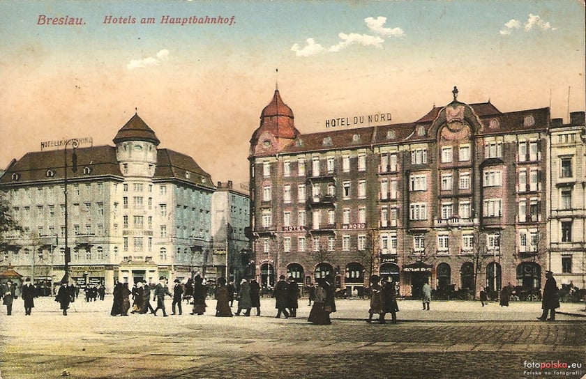 Lata 1910-1914. Po lewej Hotel Kronprinz (obecnie hotel Piast), po prawej Hotel Du Nord (hotel Grand), pomiędzy nimi obecna ul. Kołłątaja. Zdjęcie zrobiono sprzed Dworca Głównego