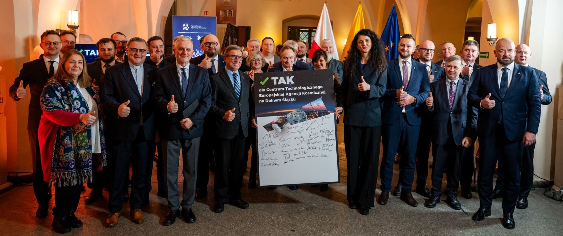 W środę 14 stycznia w Ratuszu zebrali się przedstawiciele wszystkich sił wspierających zlokalizowanie Centrum we Wrocławiu i podpisali list, który trafi do premiera Donalda Tuska i Europejskiej Agencji Kosmicznej. To wsparcie dla zlokalizowania ośrodka we Wrocławiu, które przekazuje wojewoda, marszałek, władze Wrocławia, Wałbrzycha, Jeleniej Góry i Legnicy, a nawet Drezna i Pragi, przedstawiciele wyższych uczelni Wrocławia i Opola, jak również przedsiębiorcy związani z branżą kosmiczną.
