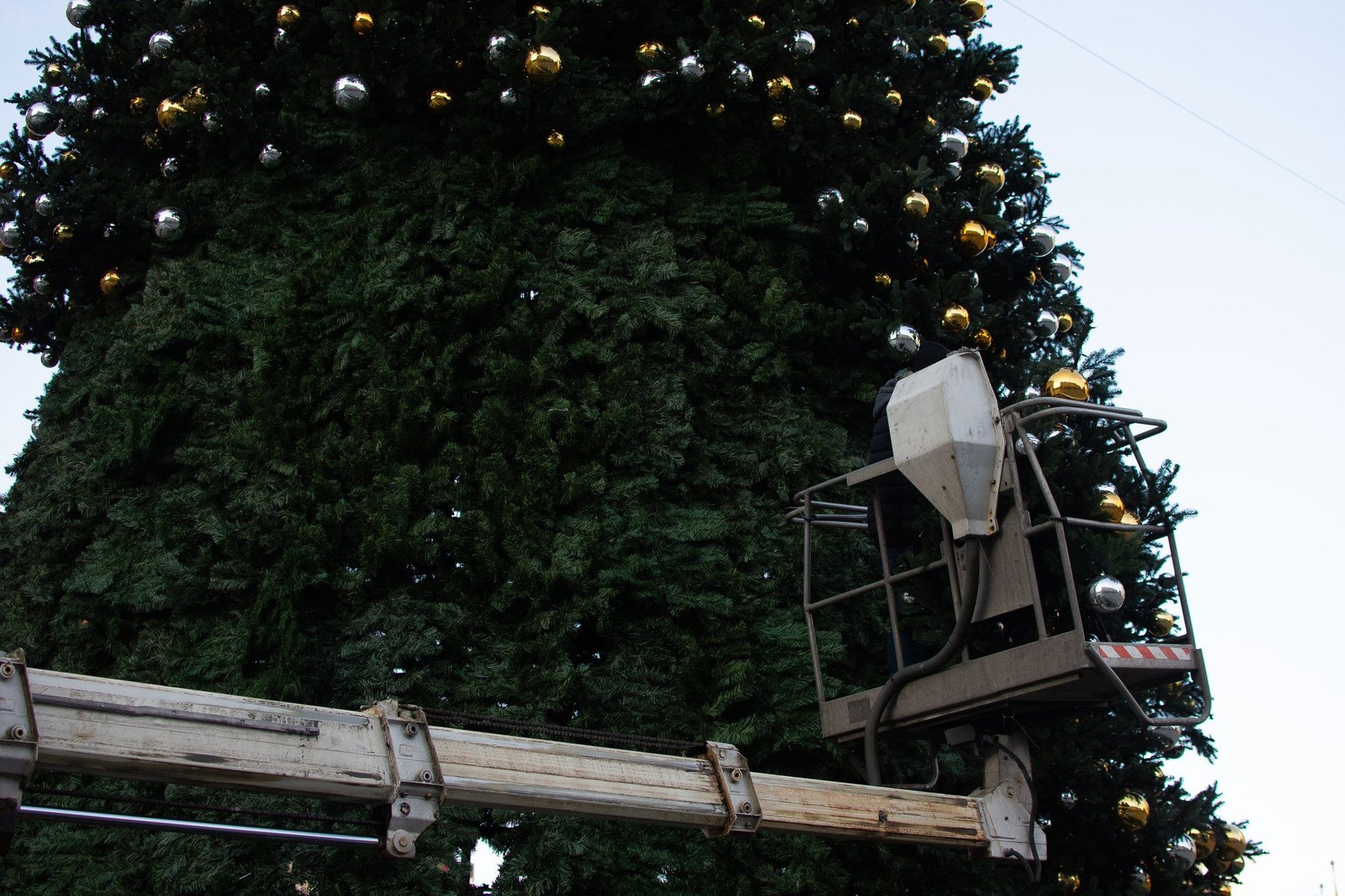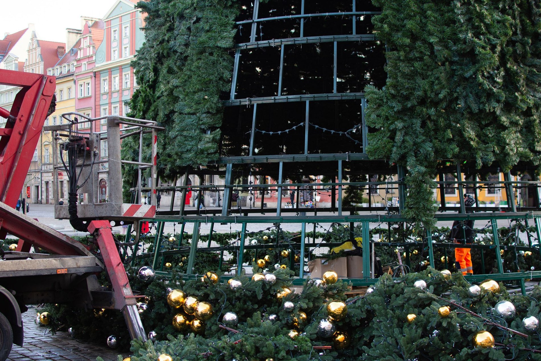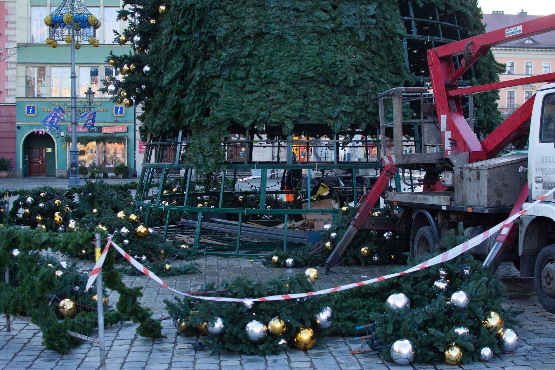 Rozbieranie i demontaż choinki na wrocławskim Rynku.