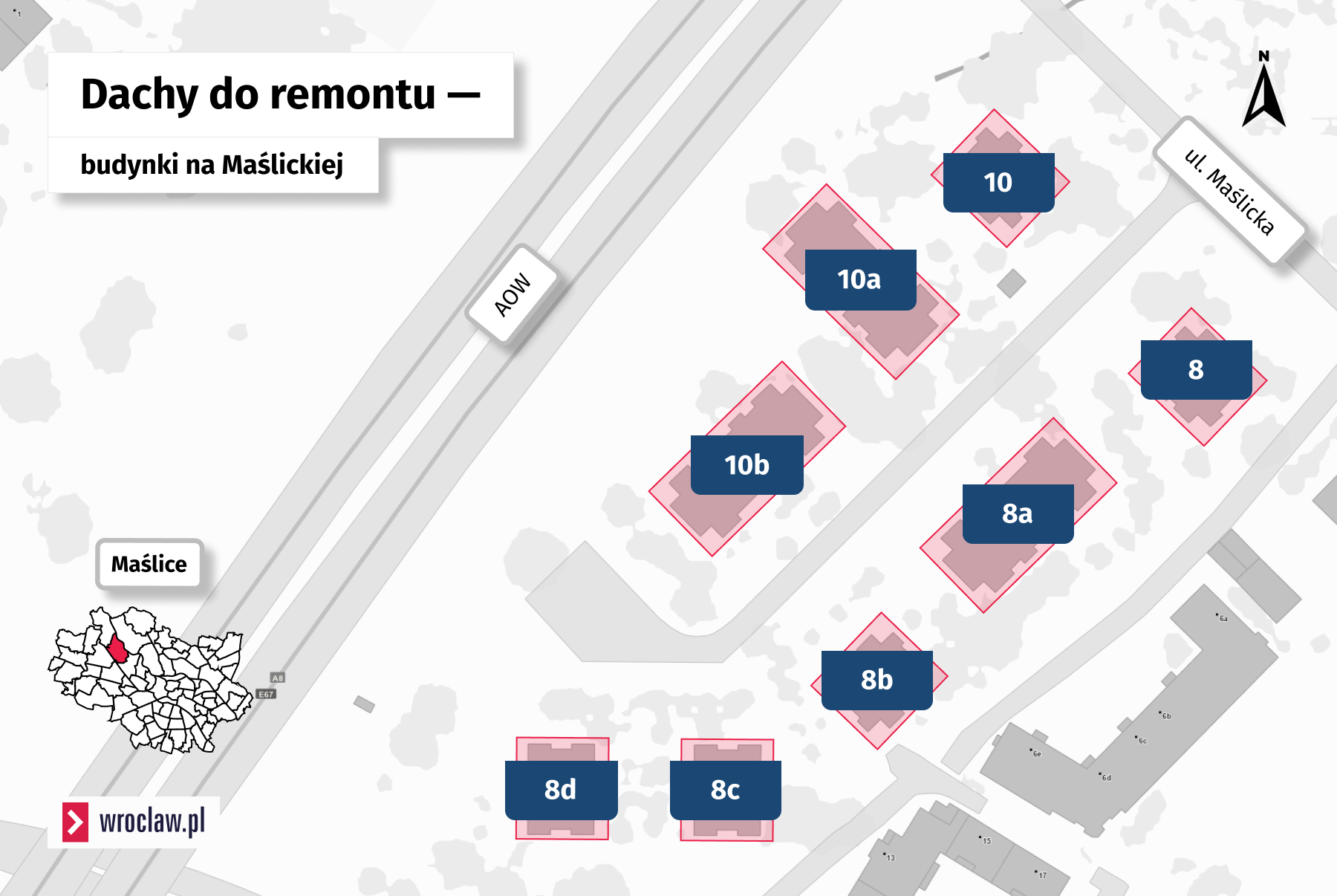 Prace czekają także dachy budynków przy ul. Maślickiej (8, 8a, 8b. 8c, 8d, 10, 10a, 10b). Ich zakres obejmie: