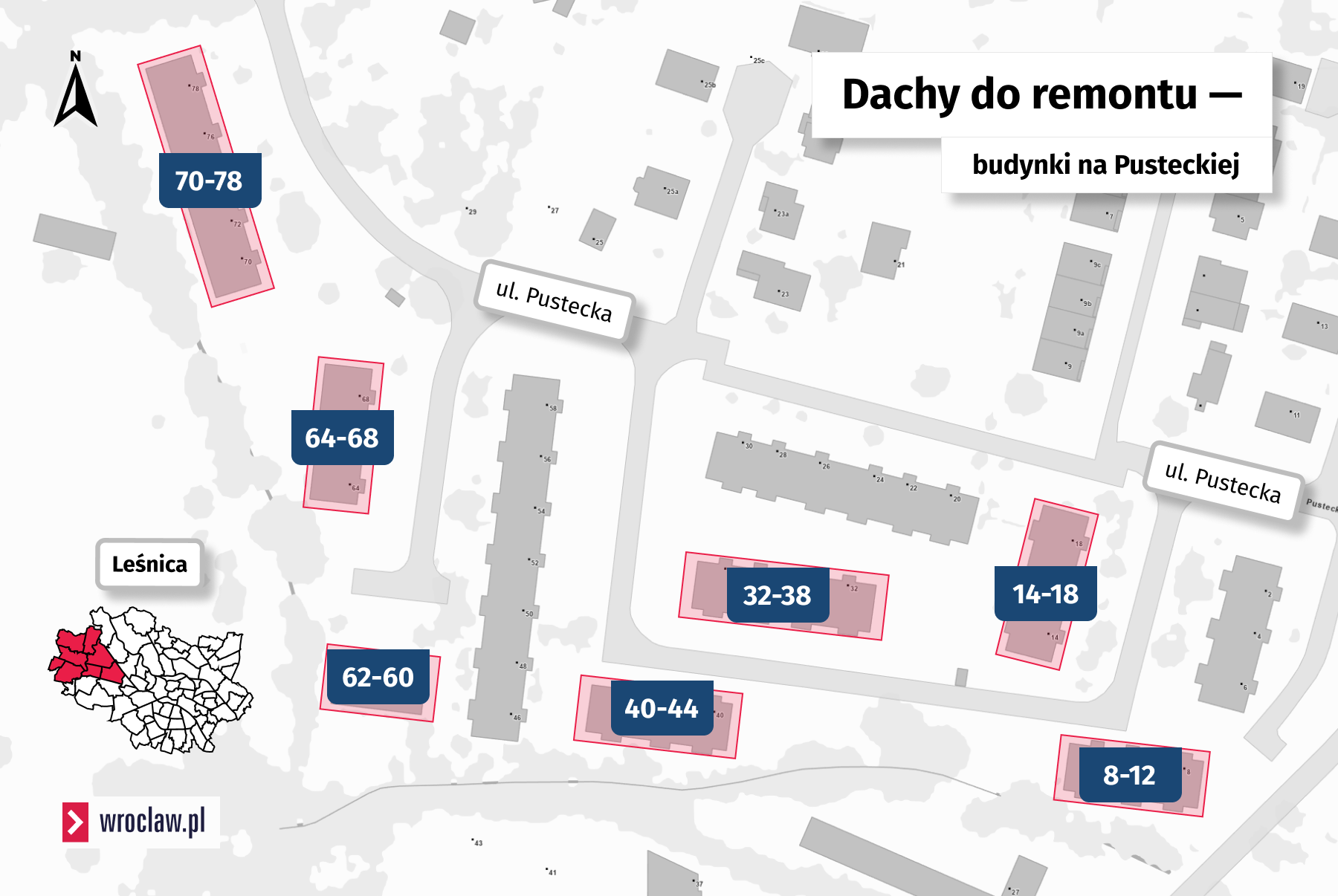 Remonty obejmują 15 dachów. To budynki przy ul. Pusteckiej (8-12, 14-18, 32-38, 40-44, 60-62, 64-68, 70-78) na Leśnicy. Tam wykonawca ma wymienić dachy z gontów bitumicznych na blachodachówkę oraz: