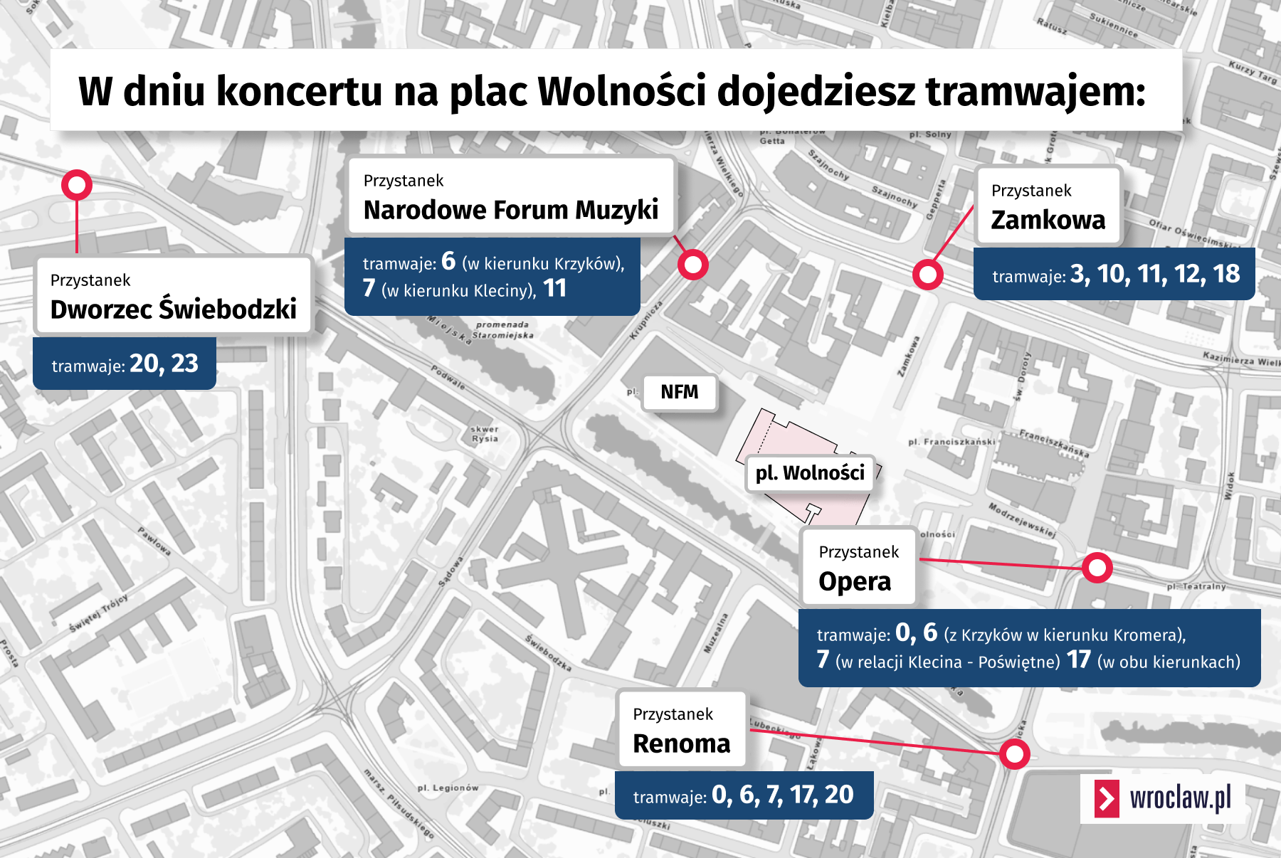 • Przystanek Narodowe Forum Muzyki: 6 (w kierunku Krzyków), 7 (w kierunku Kleciny), 11.