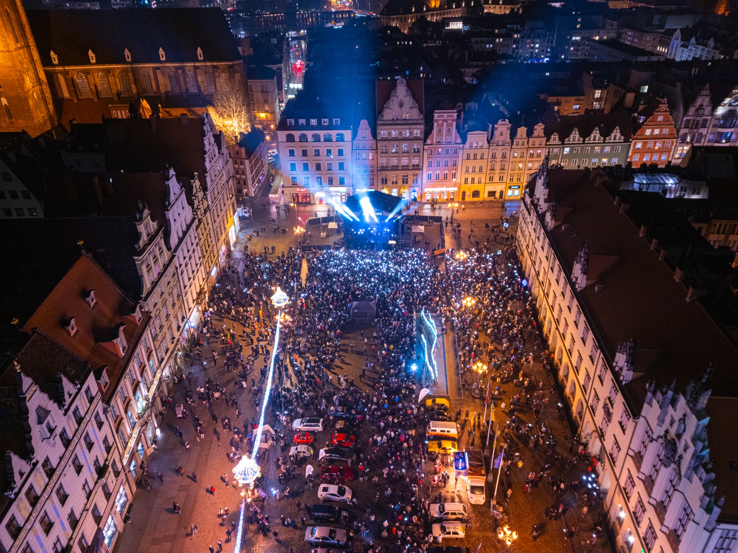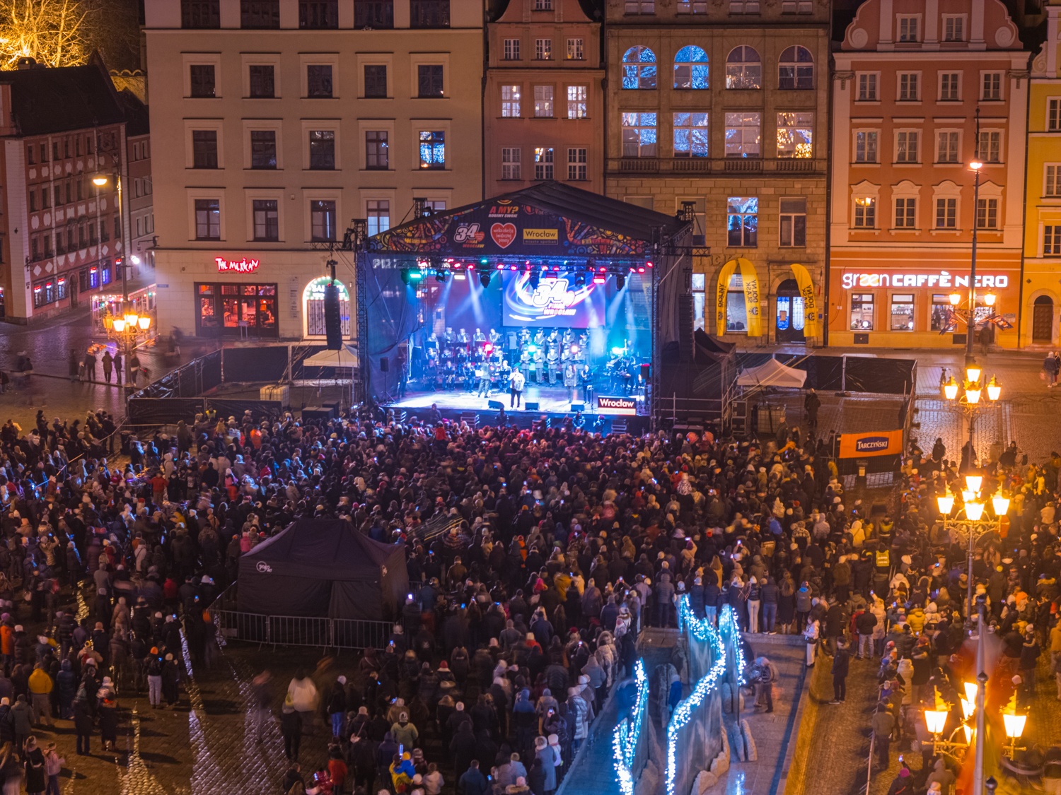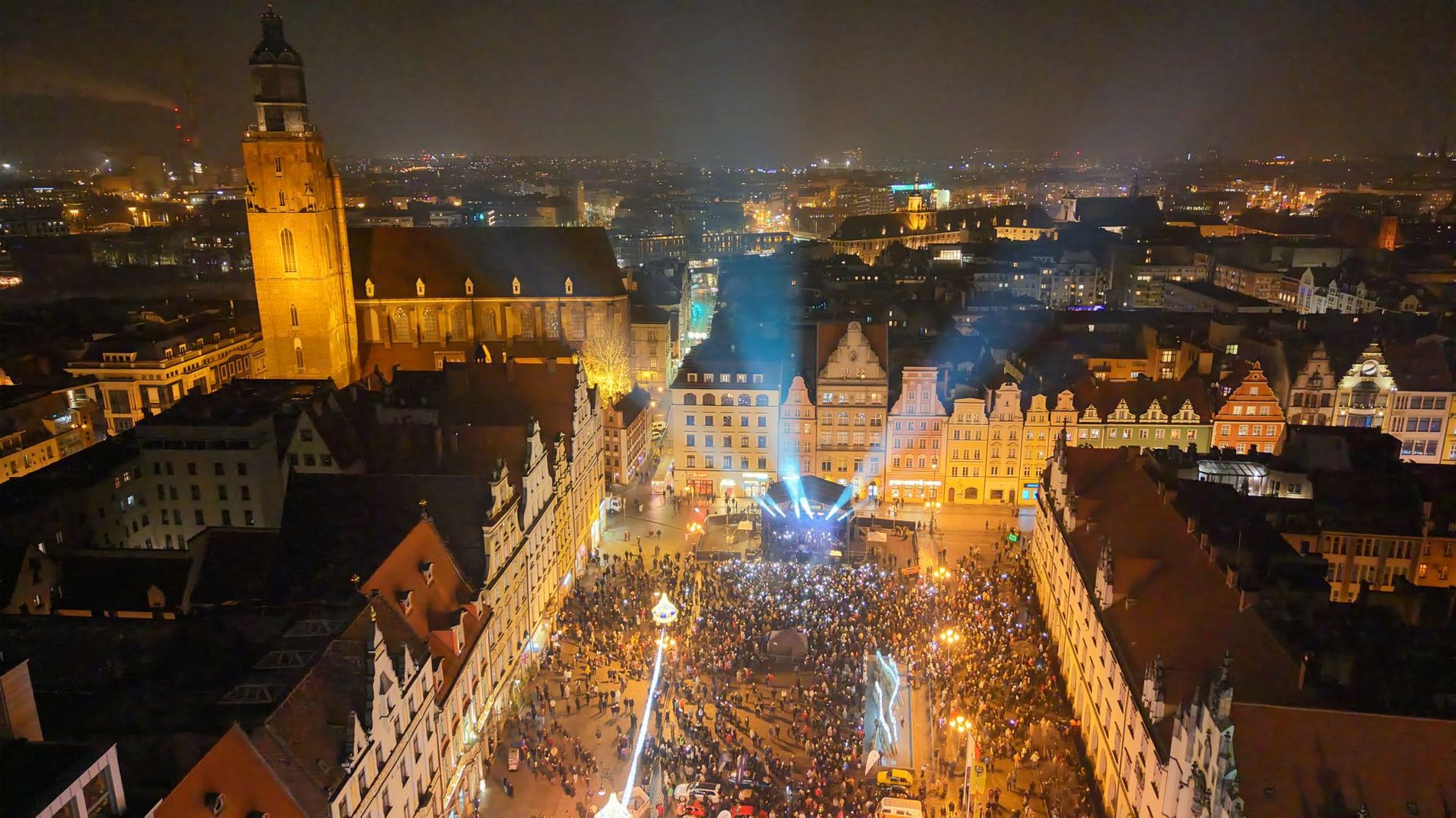 Zestawienie 2 zdjęć: z lewej zdjęcie Rynku z drona podczas Światełka do Nieba, z prawej dwie uśmiechnięte wolontariuszki WOŚP 2026 na wrocławskim Rynku pozują do zdjęcia.
