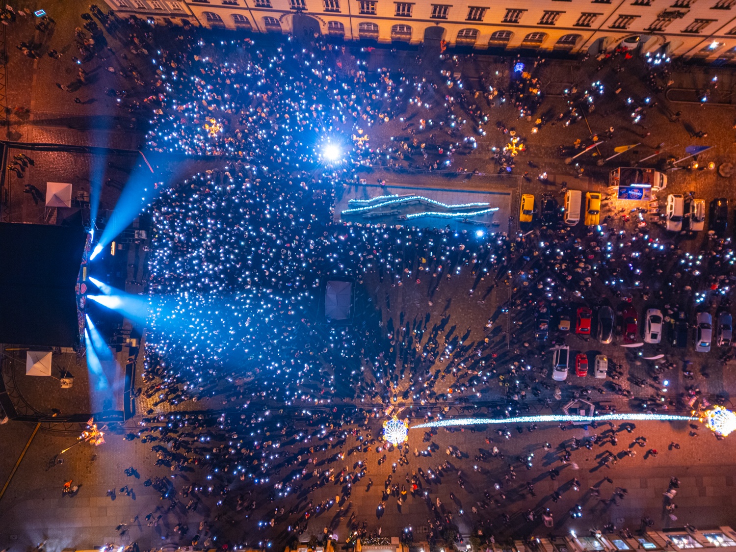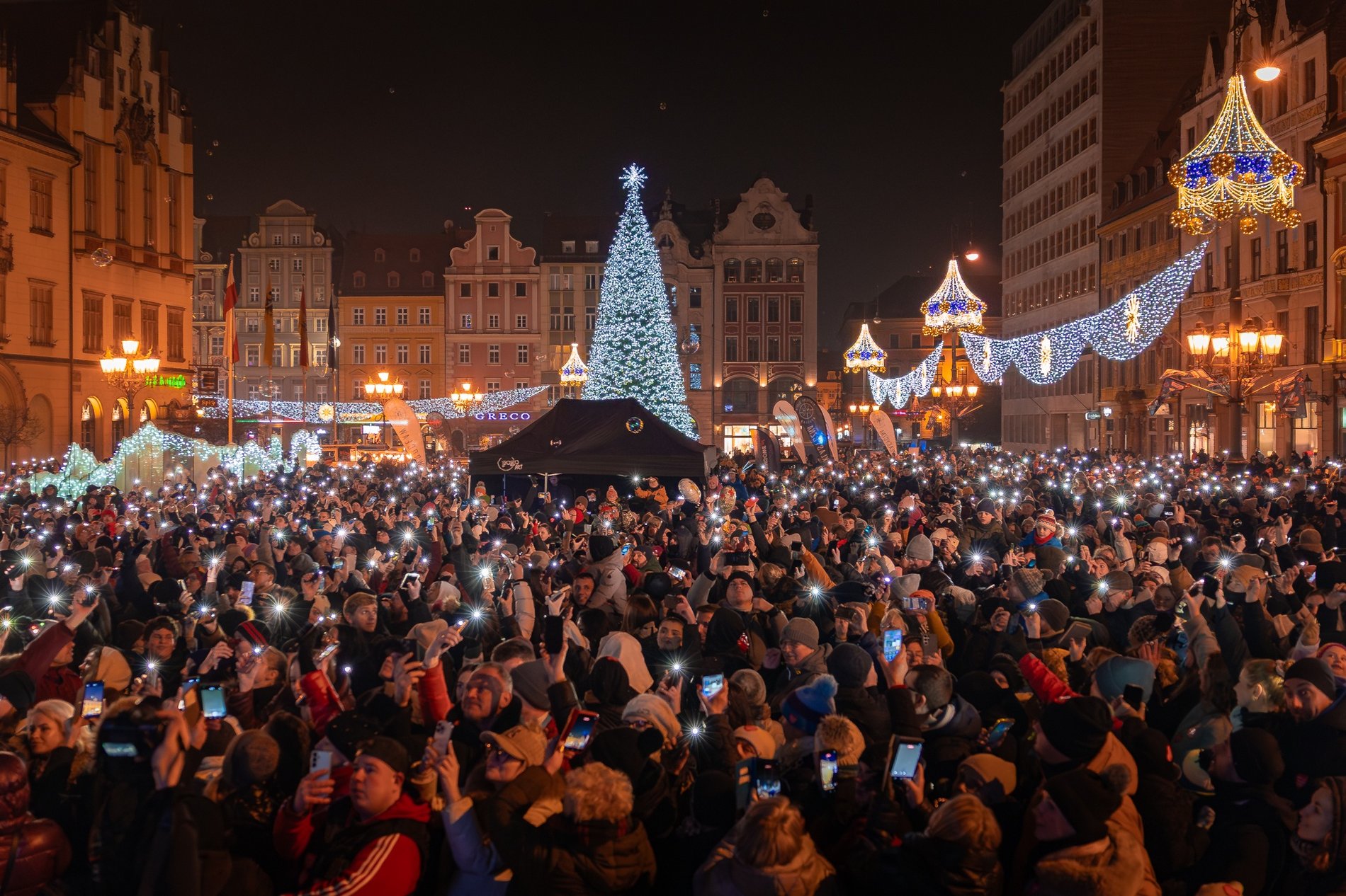 Zestawienie 2 zdjęć: z lewej zdjęcie Rynku z drona podczas Światełka do Nieba, z prawej dwie uśmiechnięte wolontariuszki WOŚP 2026 na wrocławskim Rynku pozują do zdjęcia. fot. Janusz Krzeszowski/Tomasz Hołod/Wroclaw.pl