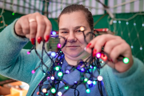 Sprzedawczyni Justyna Ambroży pokazuje światełka choinkowe