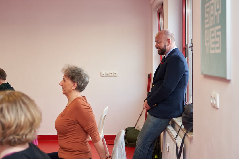 Wizyta prezydenta Wrocławia Jacka Sutryka w Fundacji Siwy Dym, która prowadzi zajęcia dla zmagających się z depresją kobiet po 60. roku życia - Jacek Sutryk podczas zajęć terapeutycznych