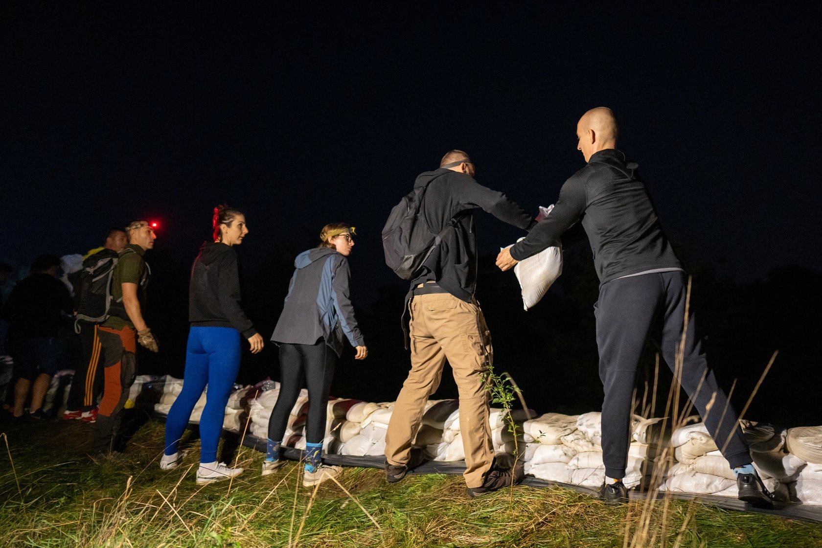 Kobiety i mężczyźni układają worki z piaskiem na Marszowicach w nocy z 17 na 18 września 2024 roku