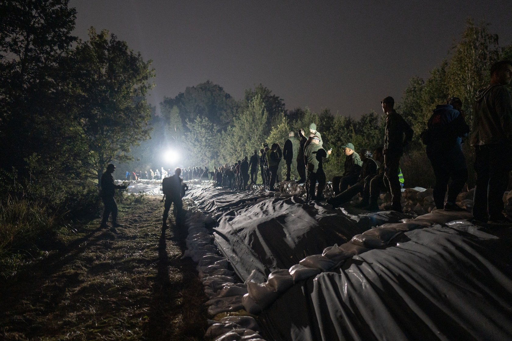 Kobiety i mężczyźni układają worki z piaskiem na Marszowicach w nocy z 17 na 18 września 2024 roku