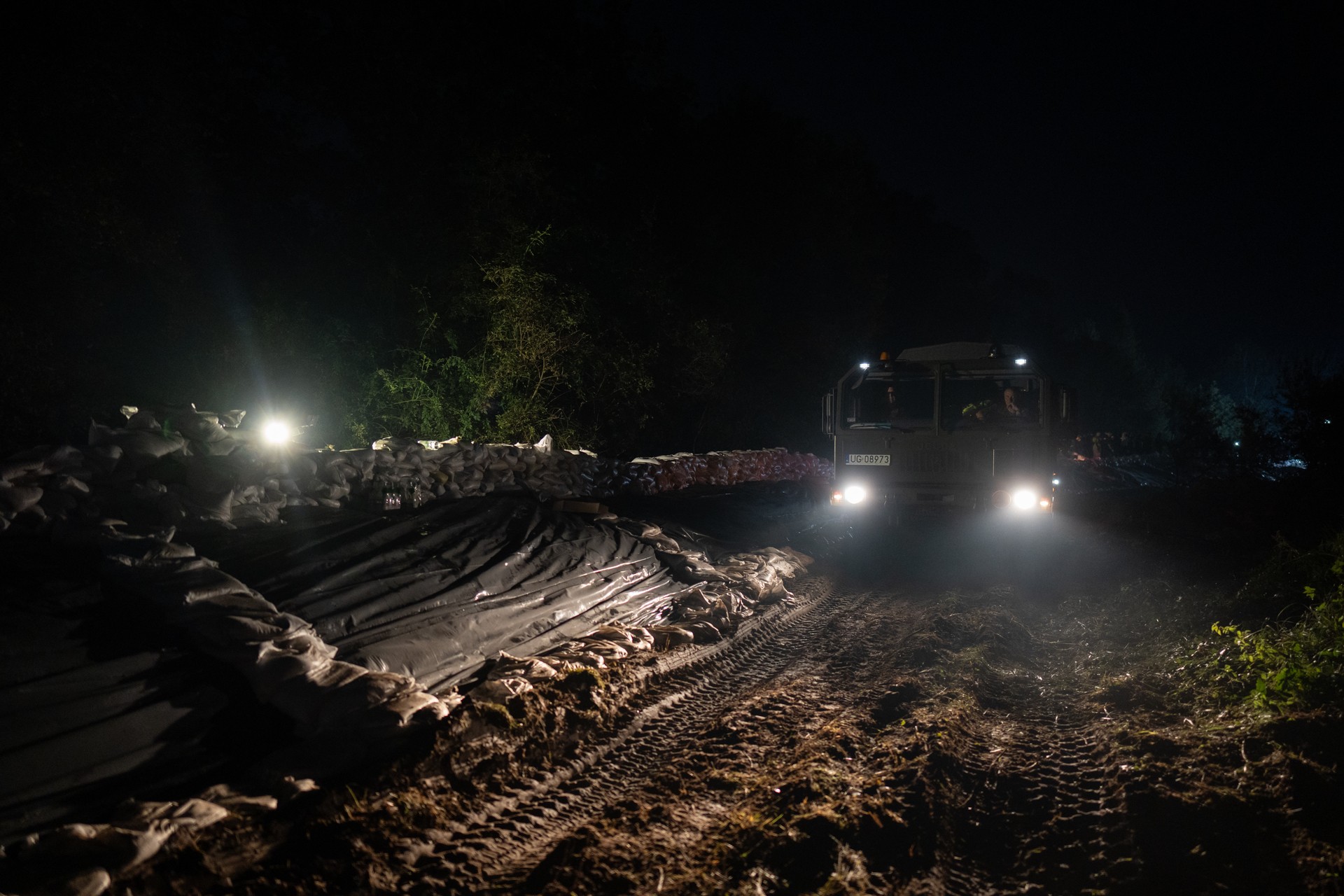 Kobiety i mężczyźni układają worki z piaskiem na Marszowicach w nocy z 17 na 18 września 2024 roku