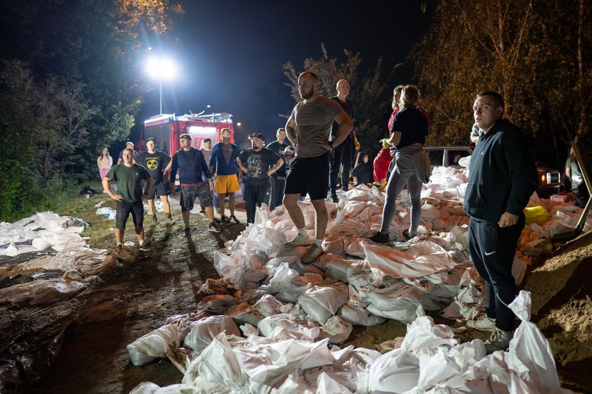 Kobiety i mężczyźni układają worki z piaskiem na Marszowicach w nocy z 17 na 18 września 2024 roku