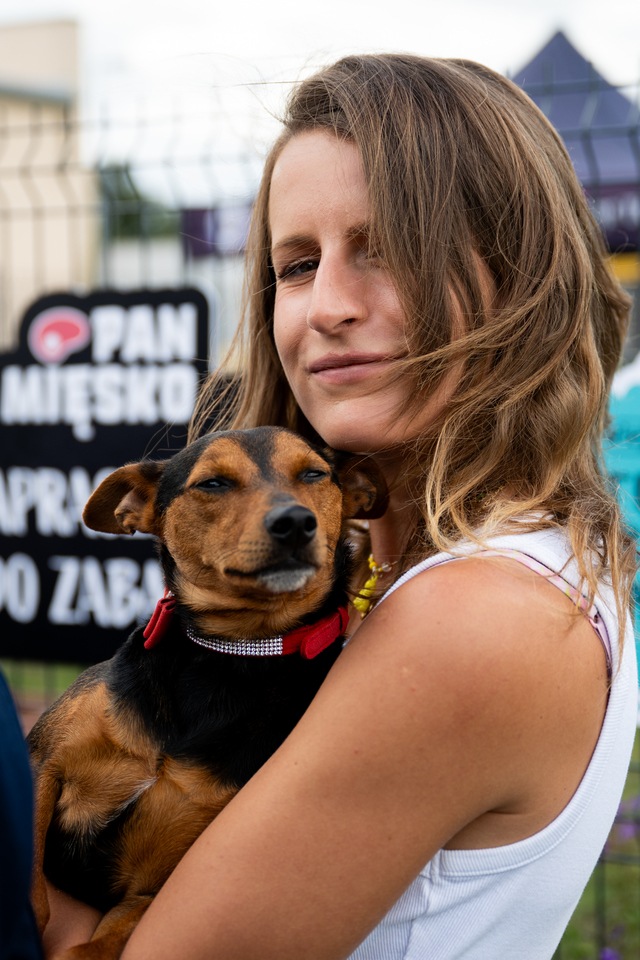 TOZ Schronisko dla Bezdomnych Zwierząt – otwarcie trzech nowych wybiegów – na zdjęciu Aleksandra Cukier, dyrektorka TOZ i podopieczny schroniska