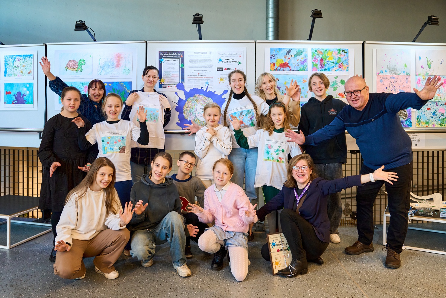 Laureaci i wyróżnieni w III edycji Międzyszkolnego Konkursu Plastycznego dla Powiatu Wrocławskiego "Nasze spotkania z twórczością Jana Brzechwy" z organizatorami na tle wystawy w Kinie Nowe Horyzonty