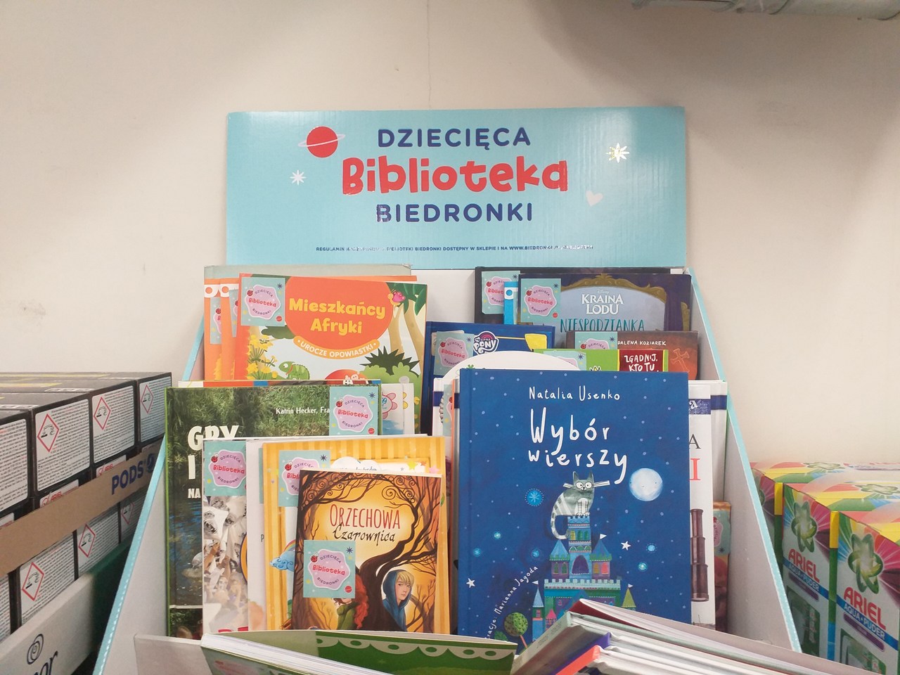 3 / 6 Wróć do artykułu W Biedronce wypożyczysz teraz książkę! Kto i na jakich zasadach może skorzystać z biblioteki w markecie? W Biedronce wypożyczysz teraz książkę! Kto i na jakich zasadach może skorzystać z biblioteki w markecie? Redakcja www.wroclaw.pl Przejdź do poprzedniego zdjęcia. Poprzednie Następne Przejdź do kolejnego zdjęcia. Tekturowy regał wystawienniczy z widocznym logo Dziecięcej Biblioteki
