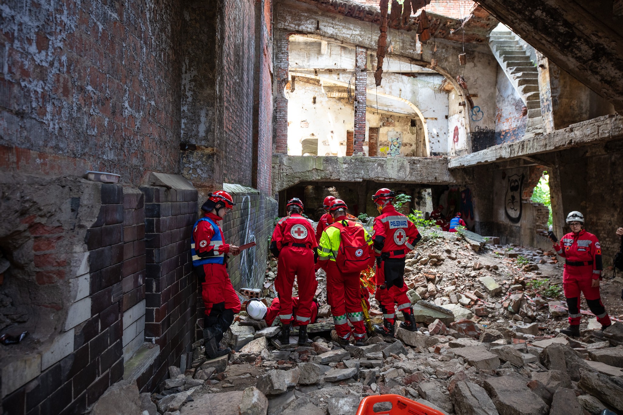 Widowiskowe ćwiczenia ratowników PCK w ruinach fabryki