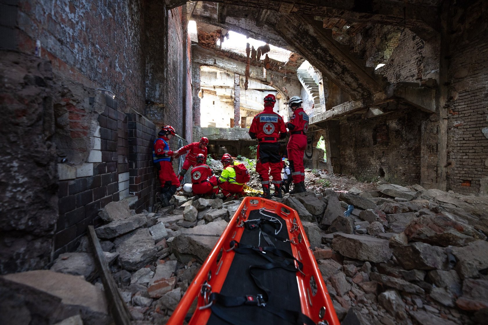 Widowiskowe ćwiczenia ratowników PCK w ruinach fabryki