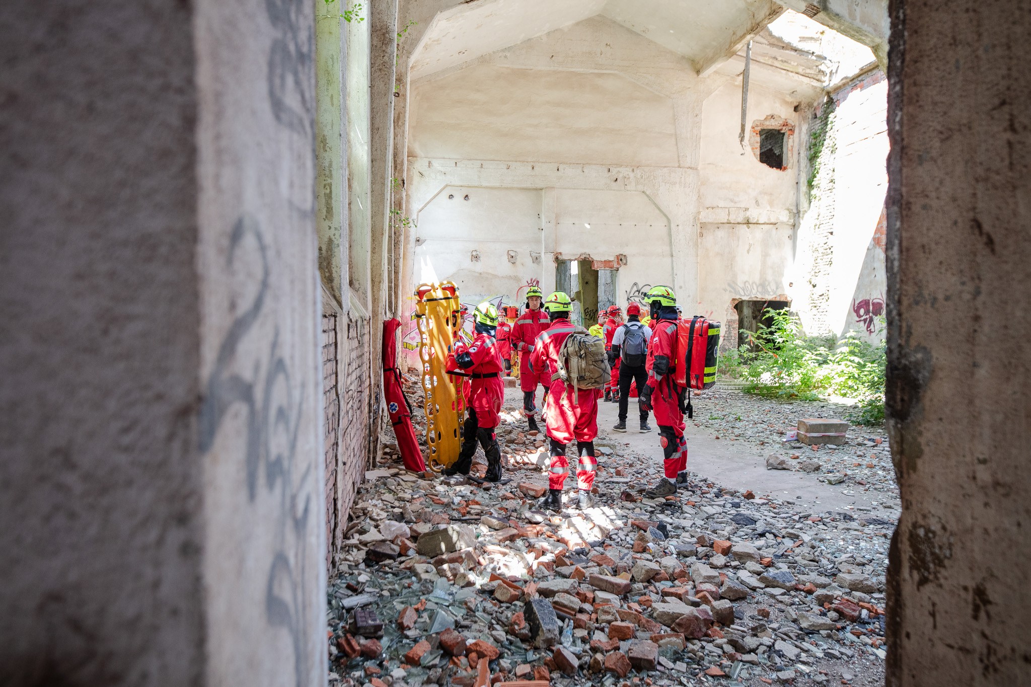 Widowiskowe ćwiczenia ratowników PCK w ruinach fabryki