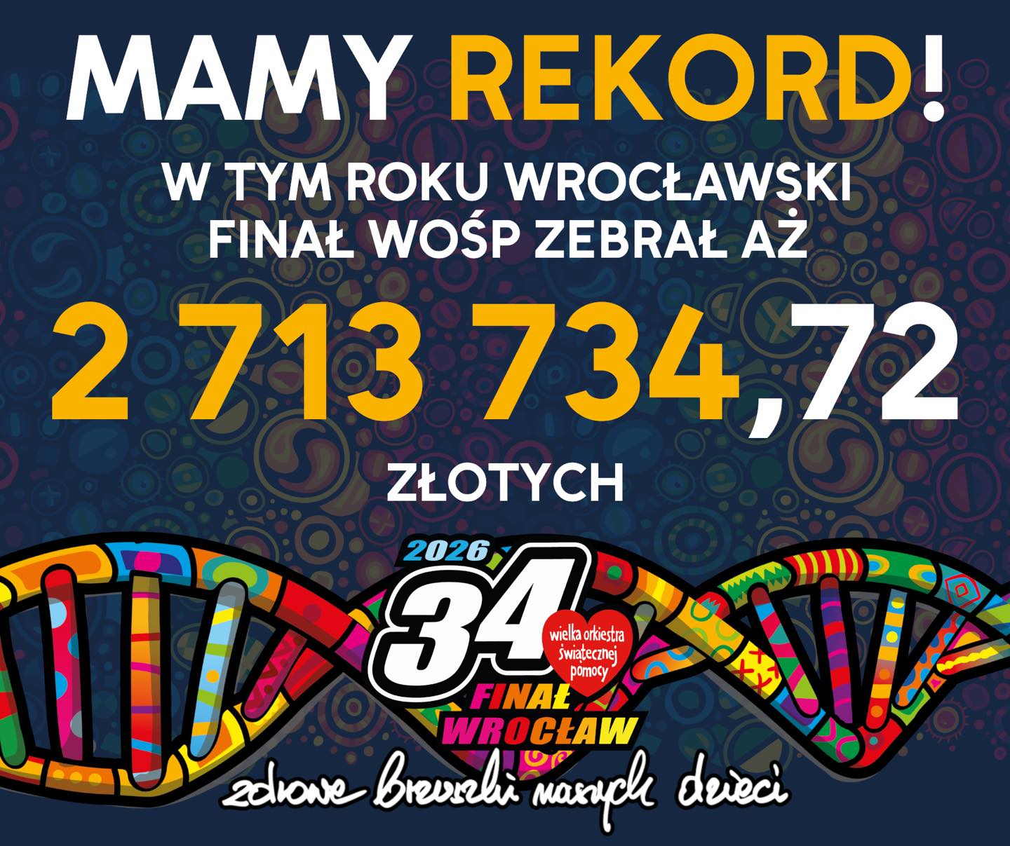 Wrocław znów to zrobił! Pobiliśmy rekord zbiórki i razem zebraliśmy 2 713 734, 72 złotych. Dziękujemy każdej osobie, która dorzuciła swoją cegiełkę - darczyńcom, wolontariuszom, licytującym i wszystkim zaangażowanym. To wspólny sukces całego Wrocławia.