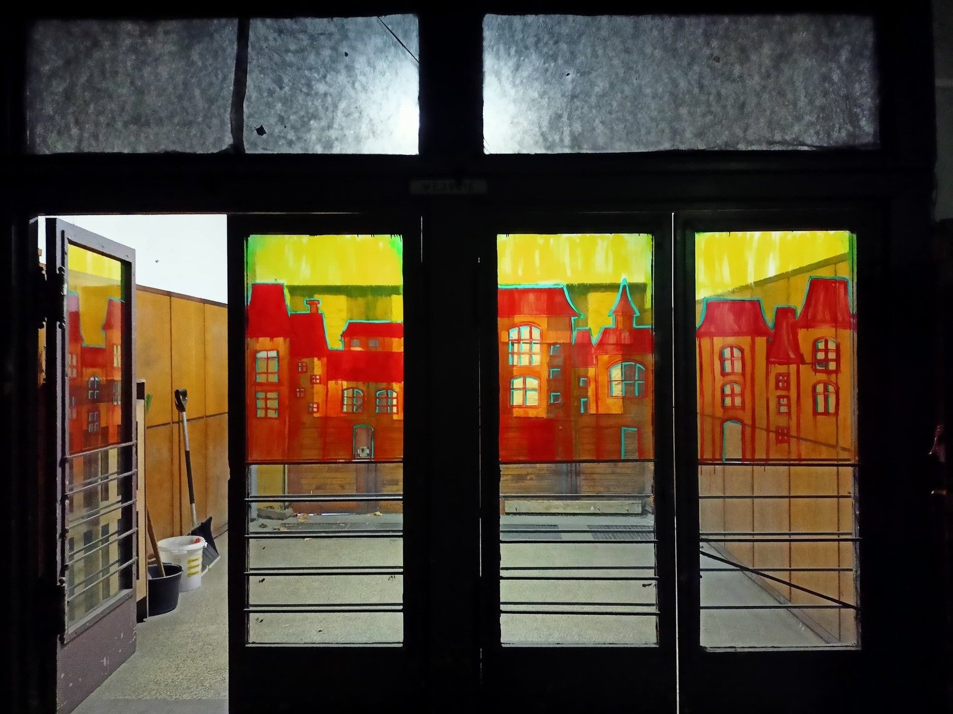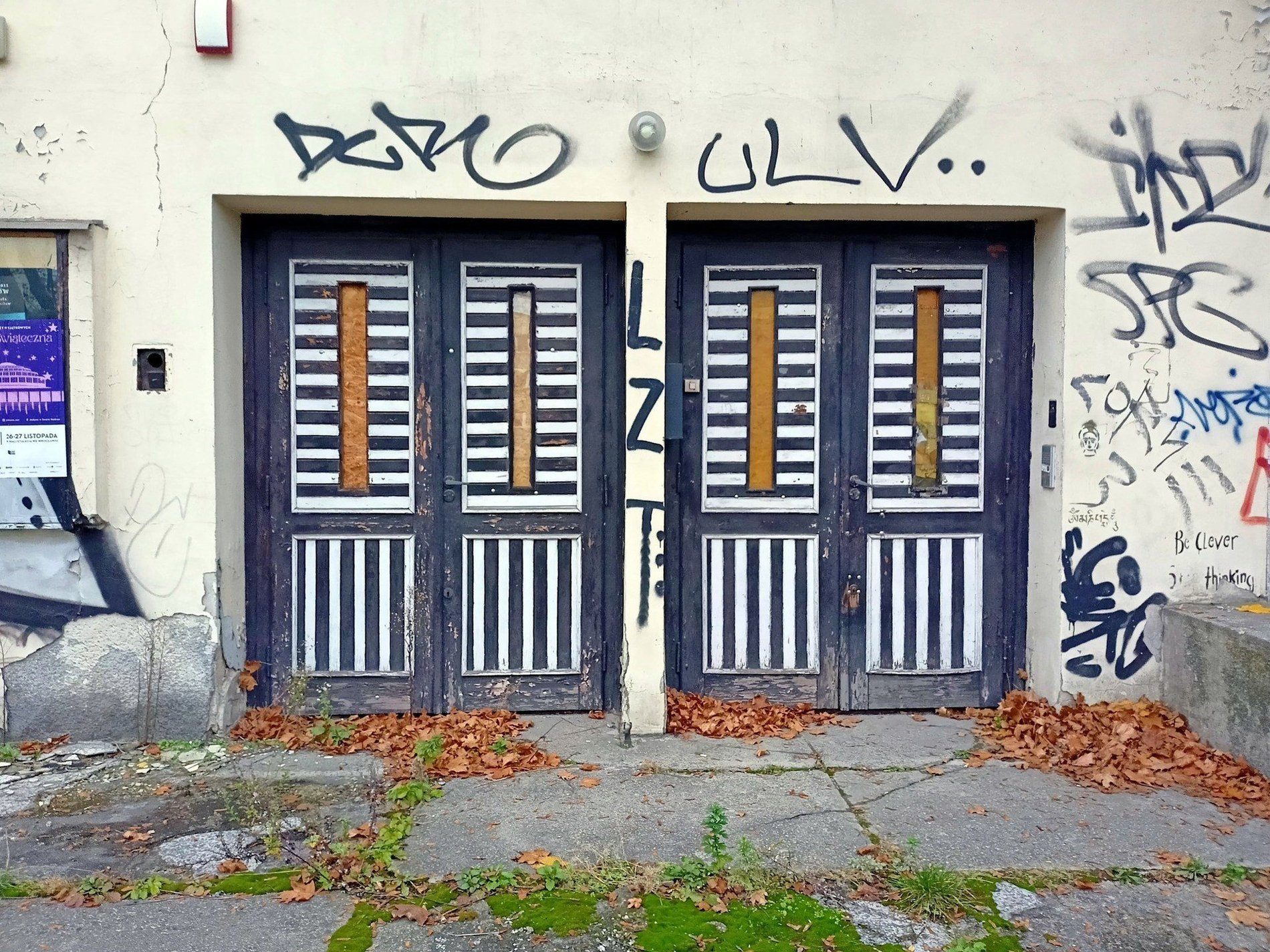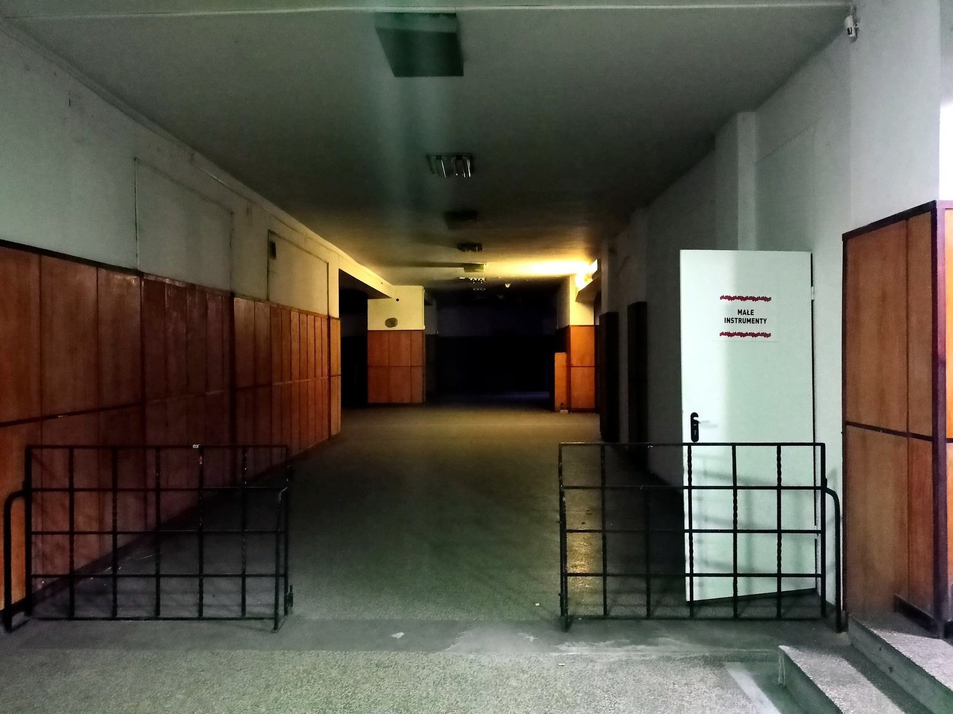 Szarość elewacji przełamywały białe akcenty. Szeroki podest wejściowy, podkreślony niskimi schodami, oświetlały dwie wysokie lampy z matowego szkła w kształcie półwalca.