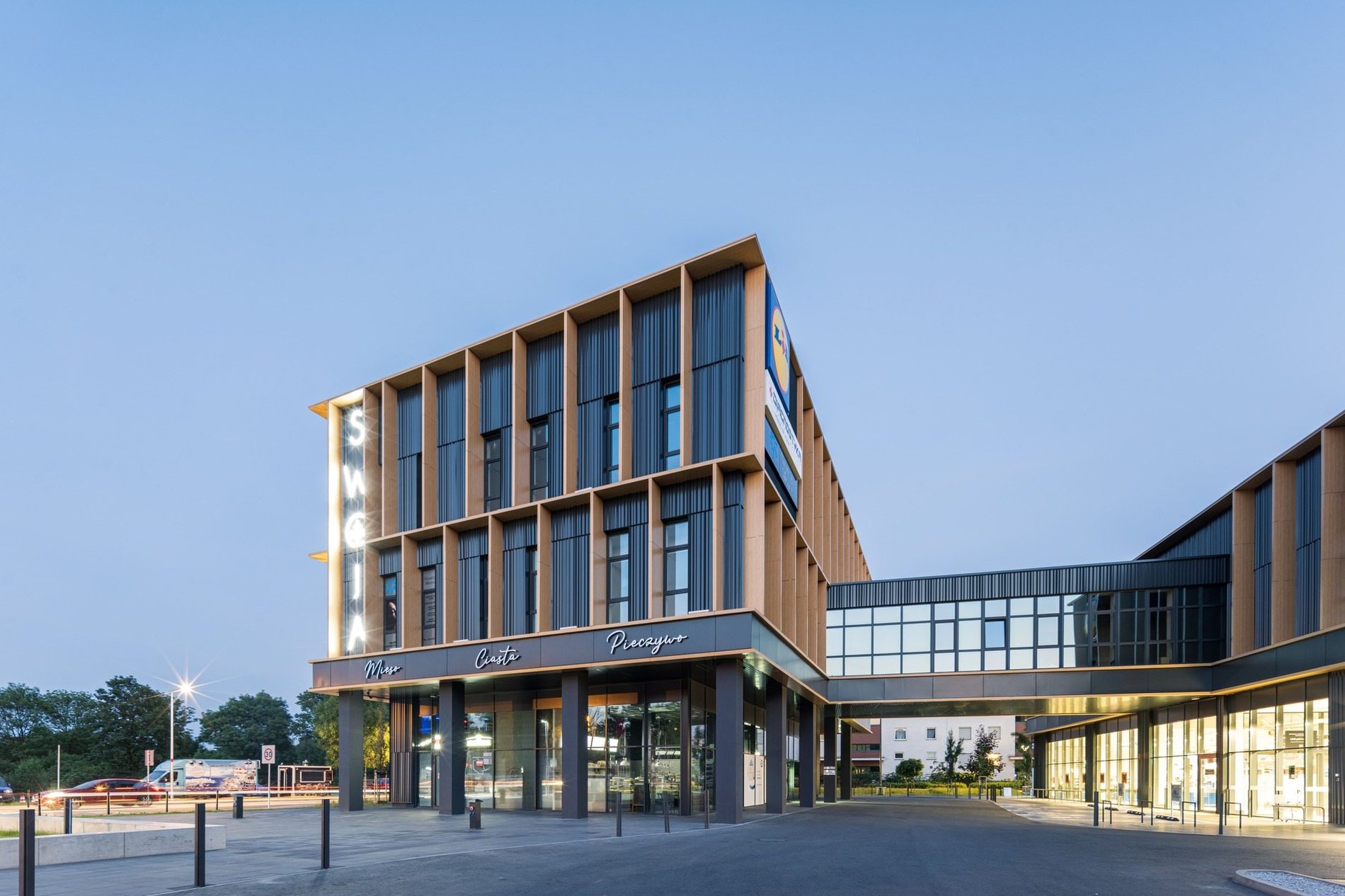 Konrad Mierzwa: Cześć rozwiązań narzucił nam plan miejscowy. Mówię tu m.in. o dominancie, czyli o wyższej części galerii w narożniku ulic Swojczyckiej i Magellana. Ona była koniecznym elementem inwestycji, bo wprost wynikała z zapisu planu, ale jednocześnie ułatwiła nam rozbicie, urozmaicenie tej bryły, co jeszcze podkreśliliśmy nadziemnym łącznikiem między dwiema częściami. Powstała swojego rodzaju brama w kierunku osiedla. Ona zaprasza przechodnia do wejścia i wciąga w interakcję. Jeśli chodzi o elewację, „żyletki” były odpowiedzią na wyzwanie wynikające z różnych funkcji, które musiały się pomieścić w obrębie tego budynku. Wiedzieliśmy, że tam będzie Lidl, ale też że potrzebne będą między innymi powierzchnie usługowe i biurowe.