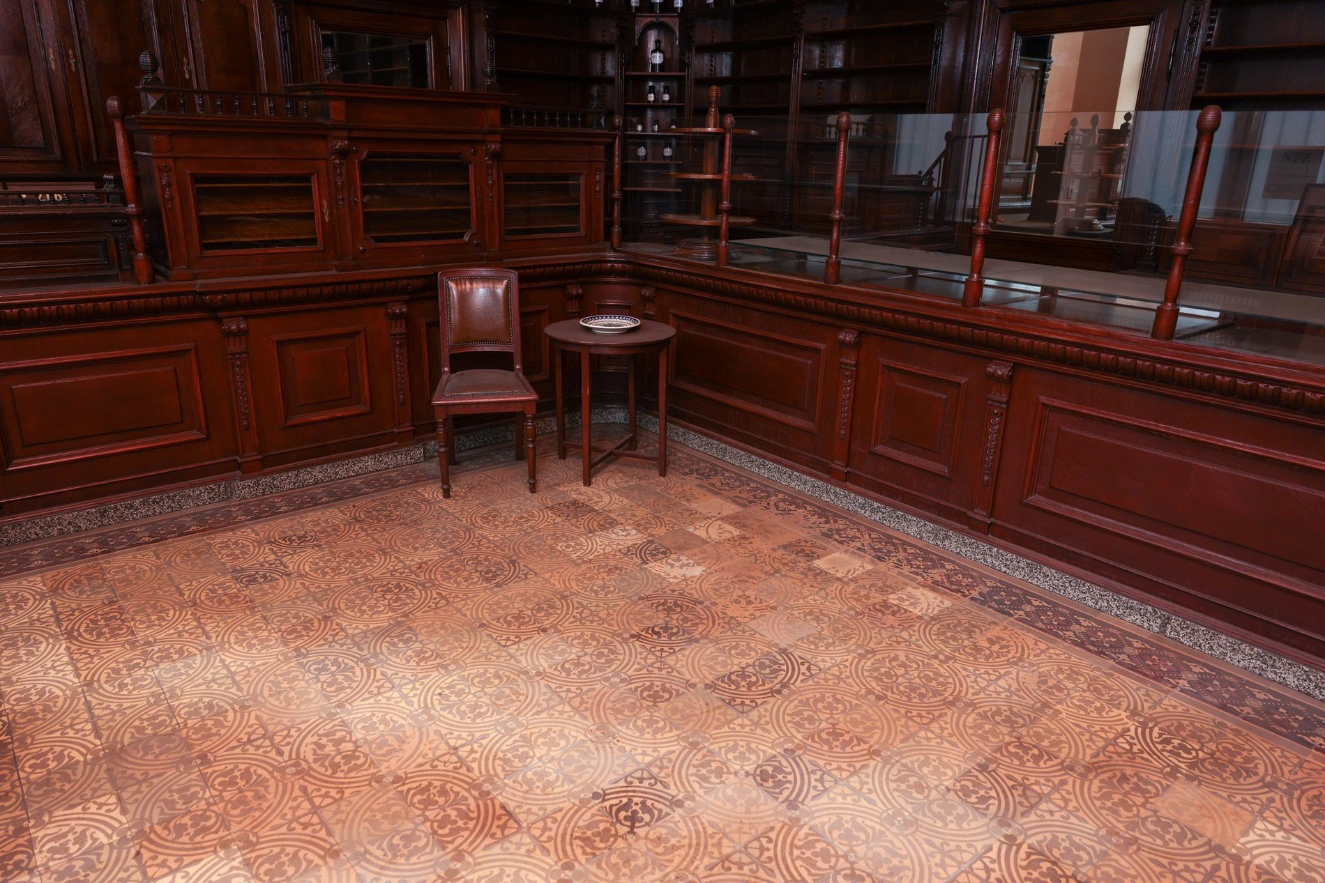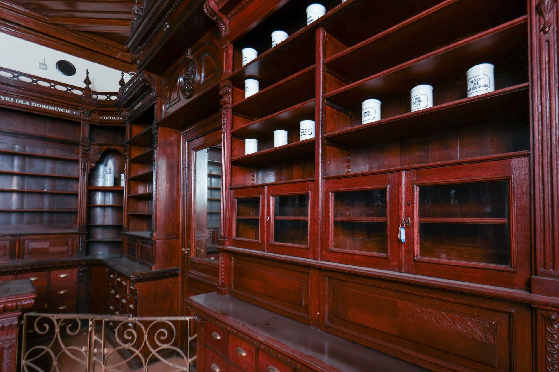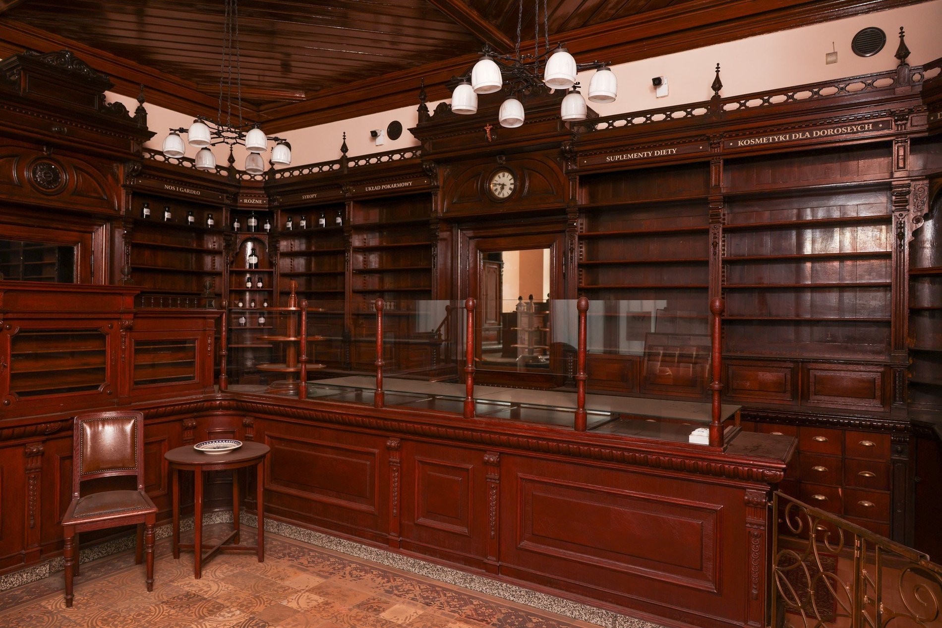 Apteka pod Słońcem - po prawej na zewnątrz, po lewej wewnątrz - drewniane meble, włącznie ze zdobnym sufitem, objęte konserwatorską ochroną