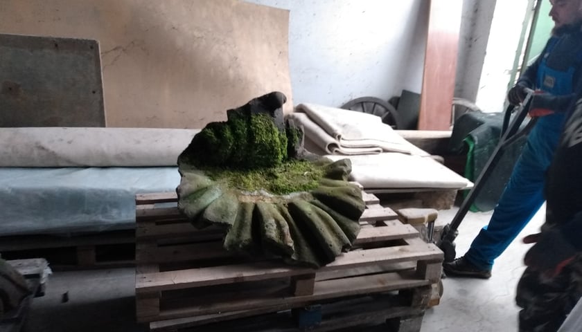 Jest porośnięta mchem, a żeby przenieść ją z samochodu, potrzeba było dwóch mężczyzn. W Wielowsi koło Sycowa na Dolnym Śląsku odnaleziono wykonaną z piaskowca muszlę. To fragment barokowej figury Neptuna, zdobiącej kiedyś fontannę na placu Nowy Targ we Wrocławiu. We wtorek 17 stycznia 2023 muszla przewieziona została do naszego miasta.