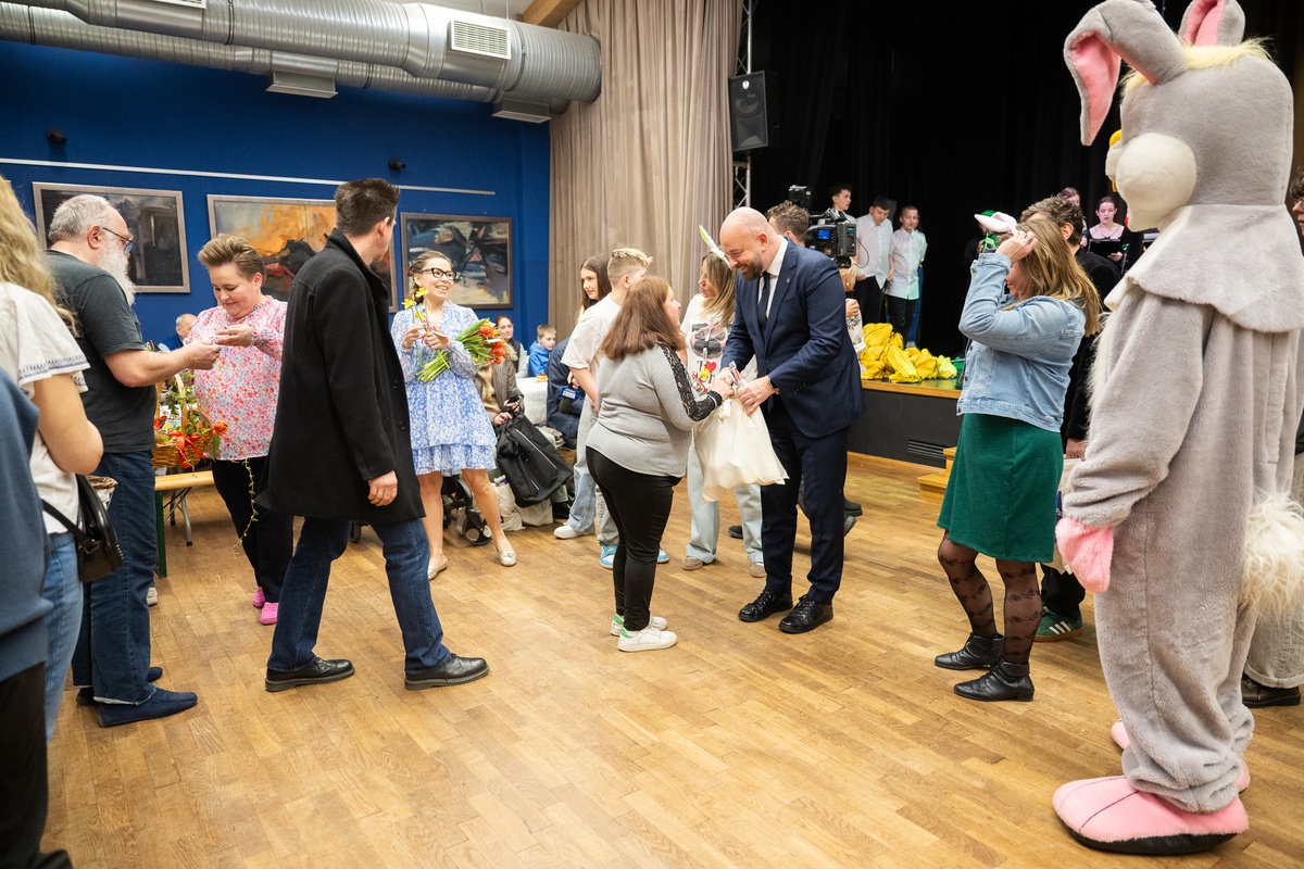 Wielkanocne Paczki Dobrych Relacji w klubie Anima we Wrocławiu - prezydent Wrocławia Jacek Sutryk na zdjęciu rozdaje paczki / 25.03.2026 r. Grzegorz Rajter / UMW