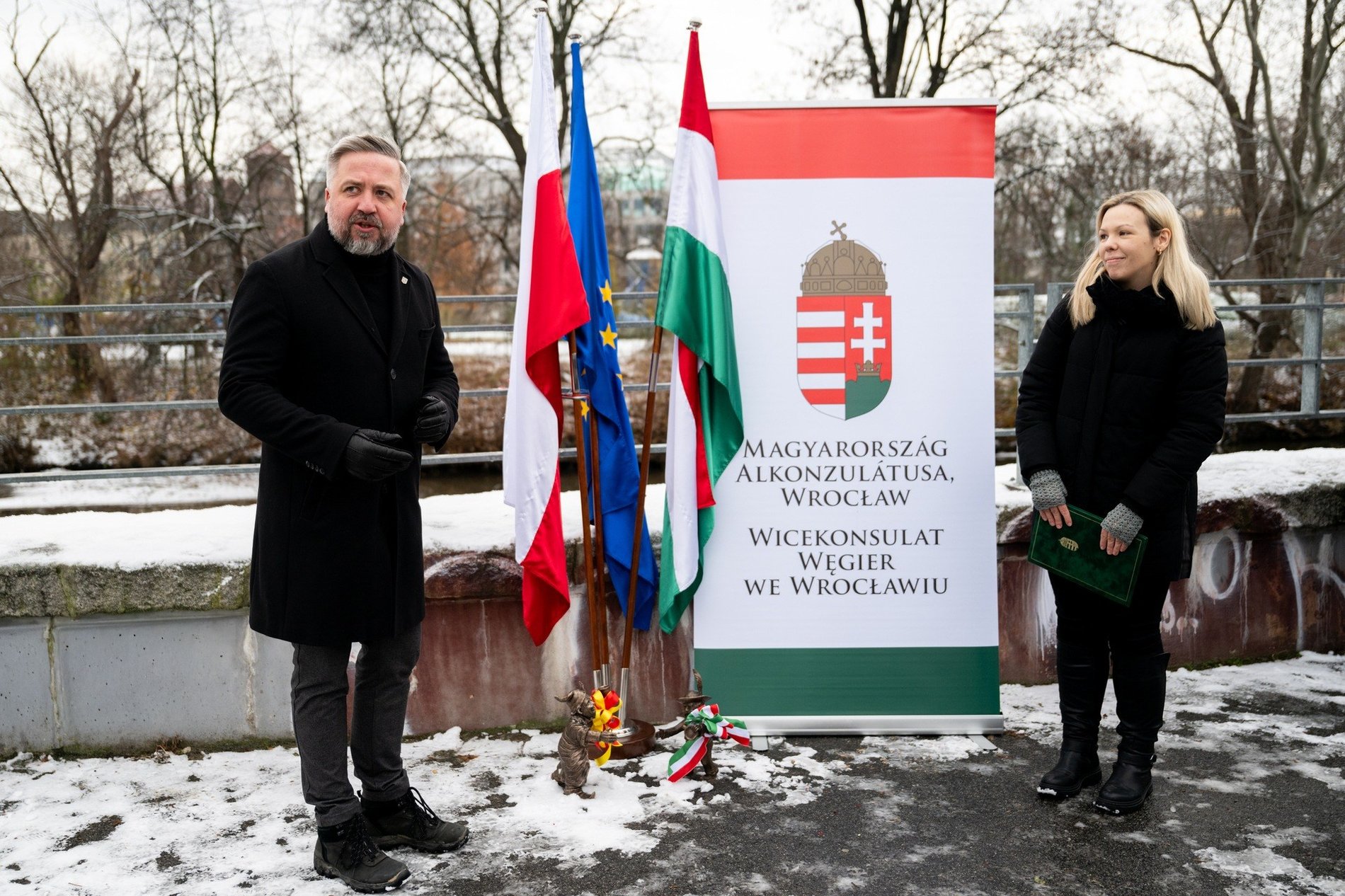 – Wspólnota wrocławska powiększyła się o dwa krasnale — zainaugurował odsłonięcie rzeźb Radosław Michalski, dyrektor Departamentu Marki Miasta przy UM. – Jest to symbol przyjaźni polsko-węgierskiej, a szczególnie wrocławsko-węgierskiej, bo właśnie tu budujemy te relacje w sposób szczególny.