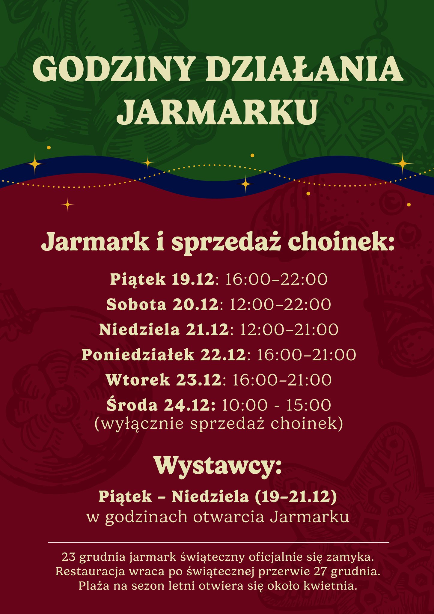 - 27-30 grudnia – jarmark czynny w normalnych godzinach - od 10:00 do 21:00,