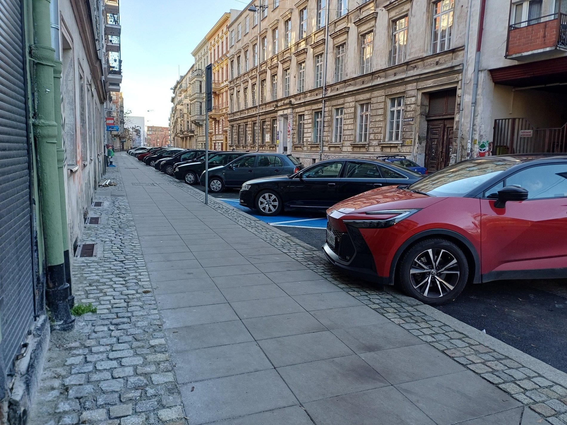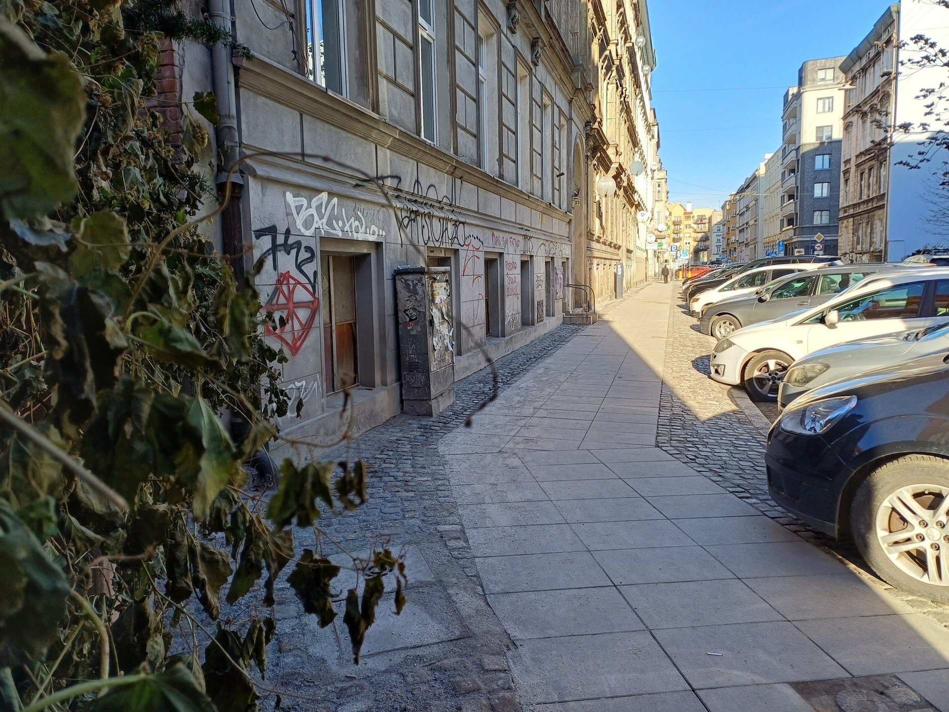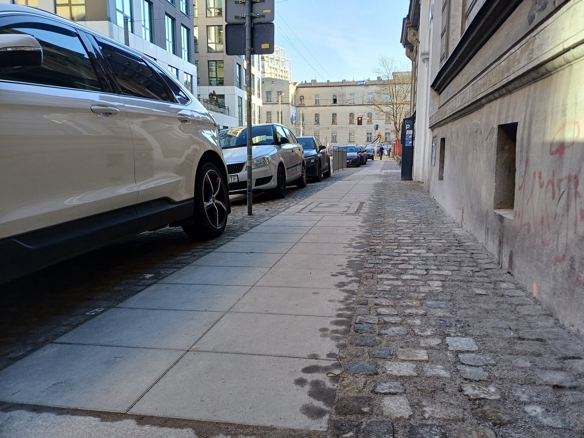 Teraz chodniki są ułożone przede wszystkim z kamiennych płyt, natomiast na zjazdach i fragmentach chodników przeznaczonych na miejsca do parkowania wykorzystano kamienną kostkę, która jest wytrzymalsza. W niektórych miejscach – np. na fragmencie ul. Dąbrowskiego użyto betonowych płytek.