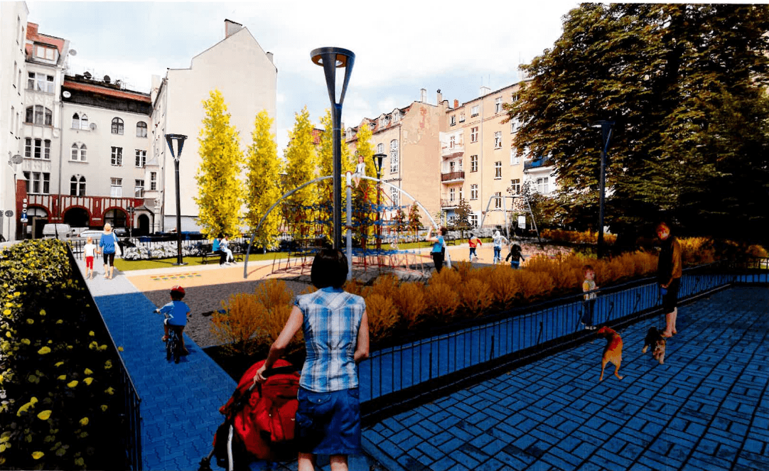 W centralnej części podwórka powstanie ogrodzony plac zabaw z bezpieczną nawierzchnią, przeznaczony dla dzieci w różnym wieku. Pojawi się wielofunkcyjne urządzenie z siatkami linowymi do wspinaczki, zjeżdżalnią i rurą strażacką, a także huśtawki.