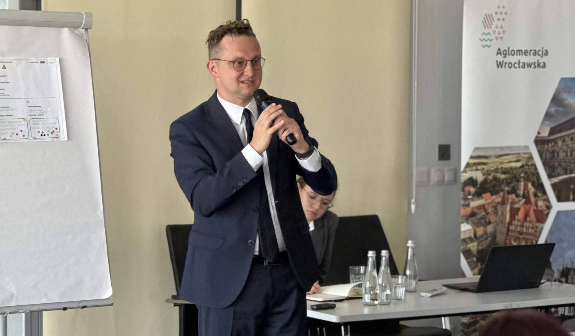 Samorządowców przywitali: Tomasz Wiśliński, Prezes Stowarzyszenia Aglomeracja Wrocławska oraz Łukasz Medeksza, Zastępca Dyrektora Departamentu Strategii i Zrównoważonego Rozwoju Urzędu Miejskiego Wrocławia, którzy przedstawili cel spotkania oraz jego główne obszary tematyczne.