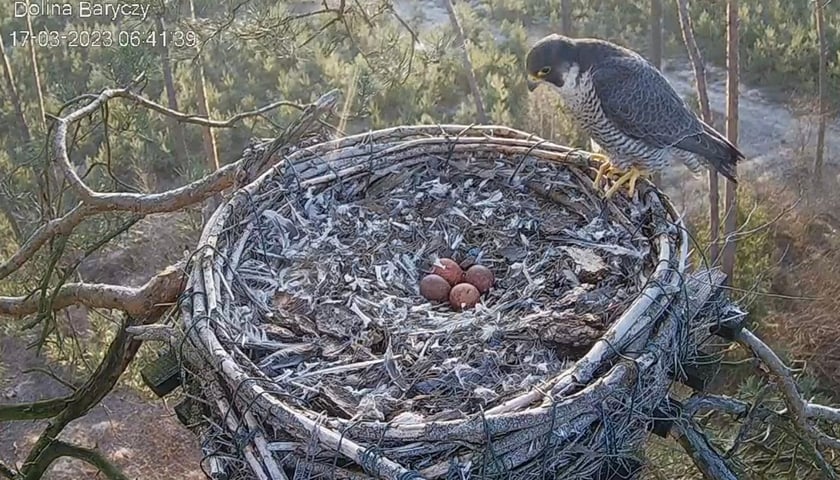 Sokoły wędrowne Borek i Zdenka, które od kilku lat wracają do swojego gniazda w Nadleśnictwie Żmigród, czekają na młode. W gnieździe są aż cztery jajka.