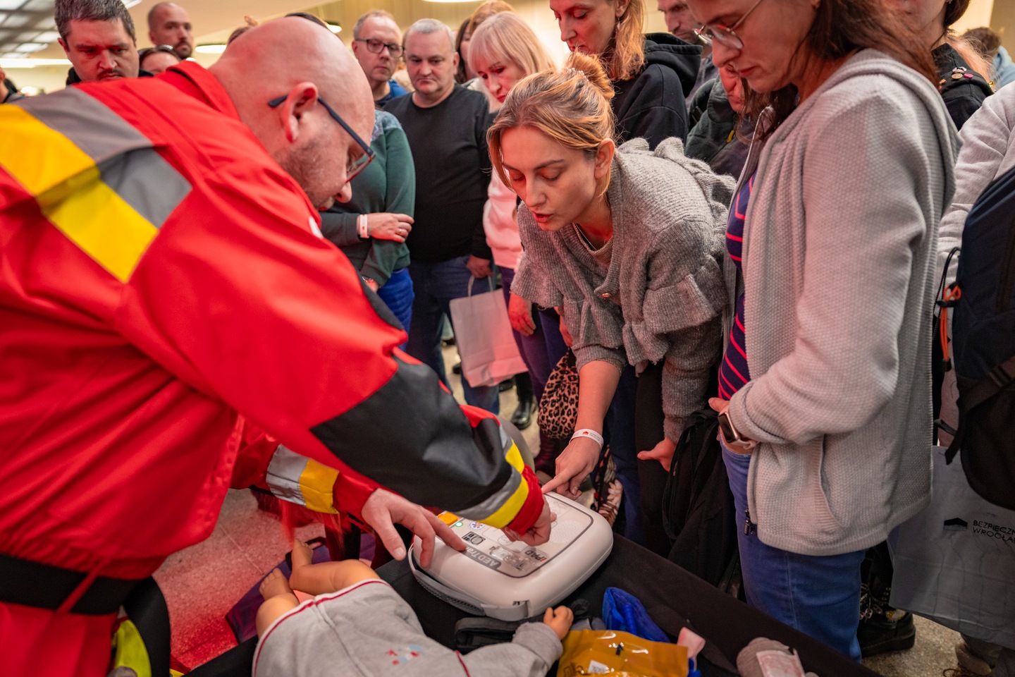 Mężczyzna i kobieta podczas ćwiczeń z pierwszej pomocy, w tle stoją ludzie Bartosz Mokrzycki