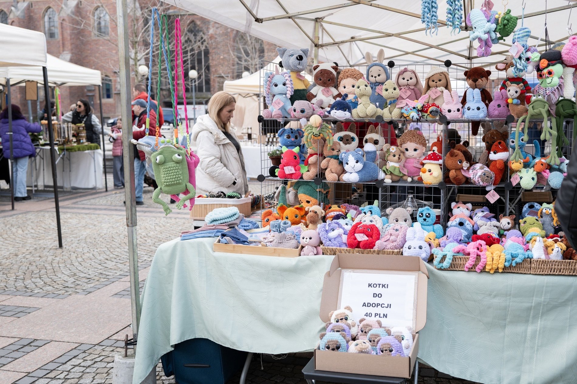 Stoiska na placu przed katedrą Marii Magdaleny we Wrocławiu - białe namioty, towary, kupcy i nabywcy