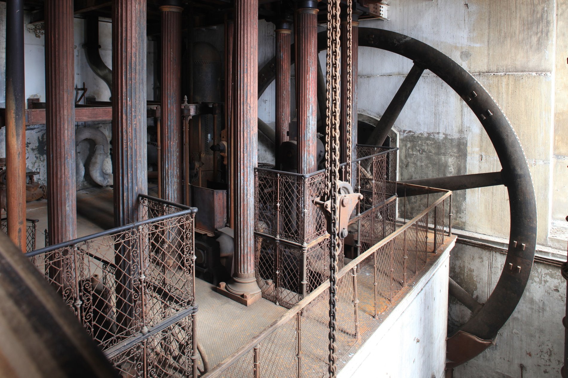 W wybudowanej wraz z pierwszym zbiornikiem maszynowni, działały w XIX wieku agregaty pompowo-parowe systemu Woolfa, tzw. "Ruffery", które to właśnie wykorzystywały potężne koło zamachowe. We wnętrzach wieży, pełną nomen omen parą, pracowały dwie maszyny o mocy 150 KM.