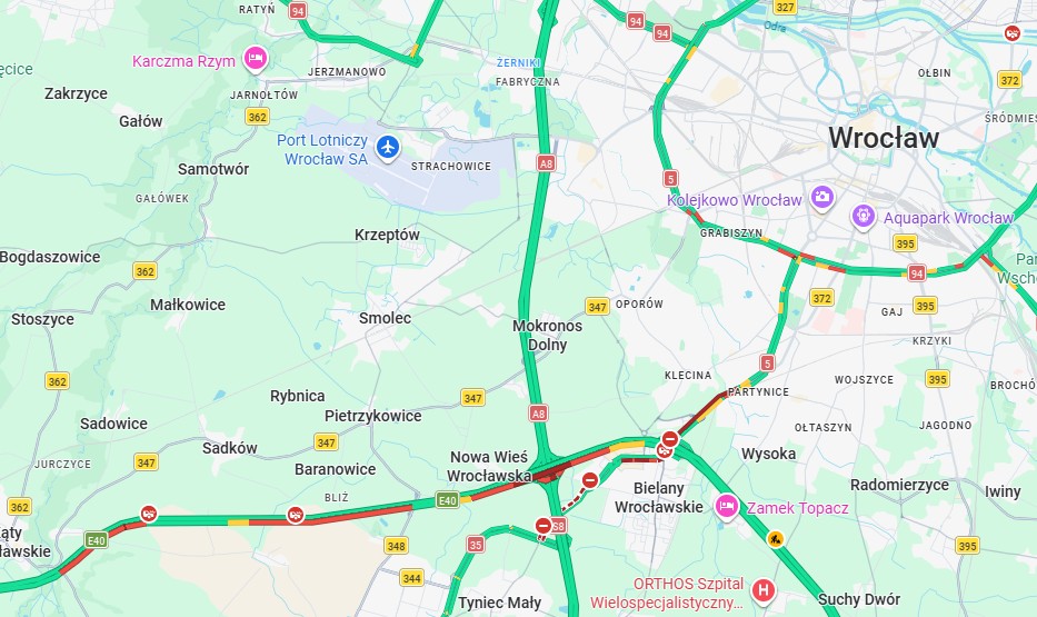 Zobacz, na mapie gdzie jest korek na A4 i południu Wrocławia