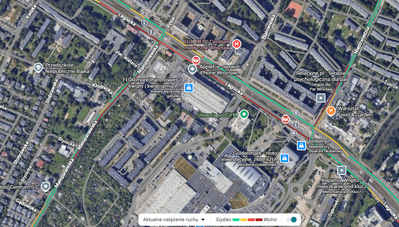 Powiększ obraz: <p>Utrudnienia w ruchu po dw&oacute;ch kolizjach na Legnickiej, mapa. 22.12.2025, stan na godz. 16.00.</p> Google Maps