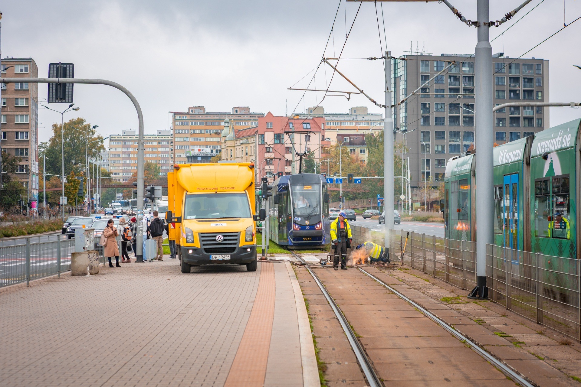 Naprawa pękniętej szyny na placu Jana Pawła II