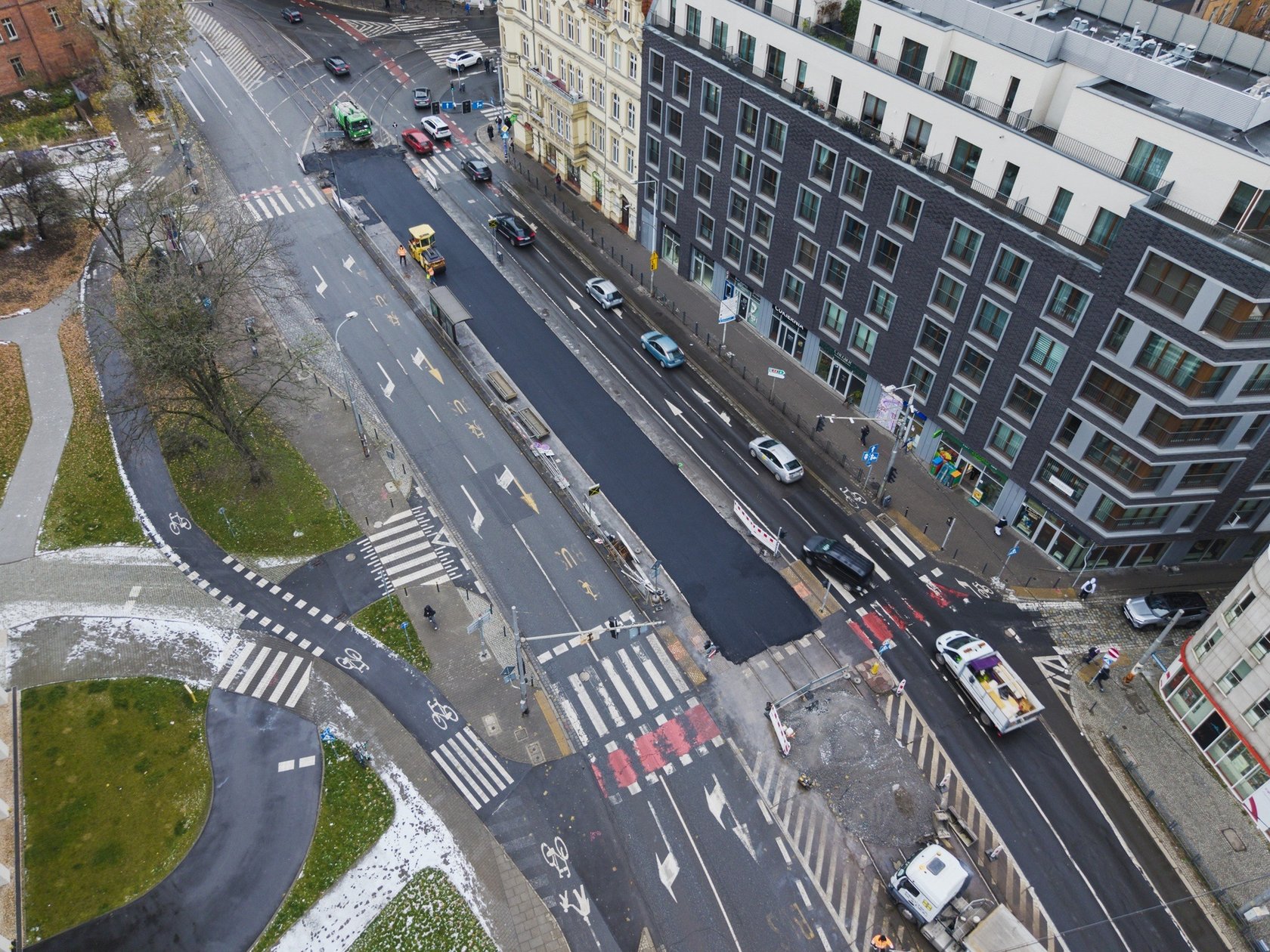 W poniedziałek 24 listopada wykonawca kładł masę bitumiczną w miejscu torowiska. Tak powstaje tymczasowa jezdnia, którą wkrótce będą jeździć kierowcy