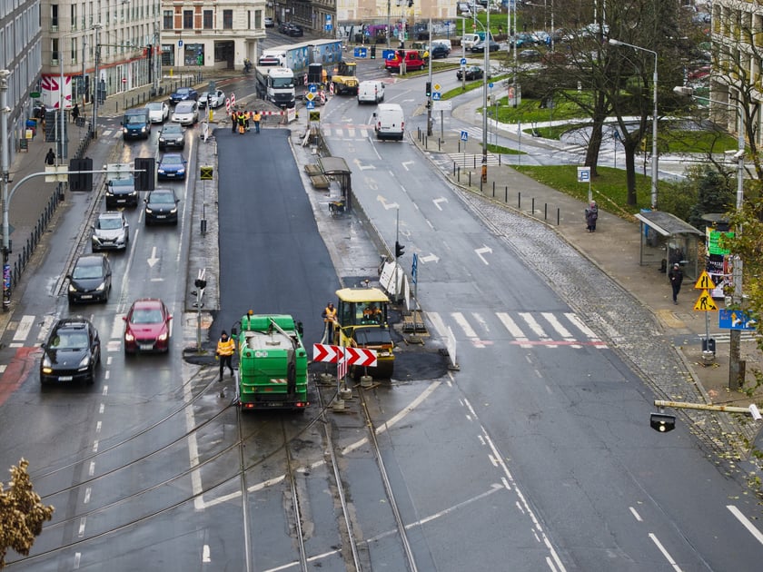 W poniedziałek 24 listopada wykonawca kładł masę bitumiczną w miejscu torowiska. Tak powstaje tymczasowa jezdnia, którą wkrótce będą jeździć kierowcy