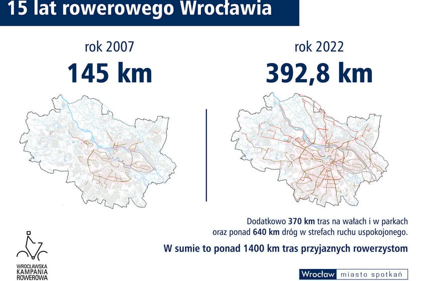 15 lat Rowerowego Wrocławia - porównanie km dróg rowerowych w 2007 i 2022 roku