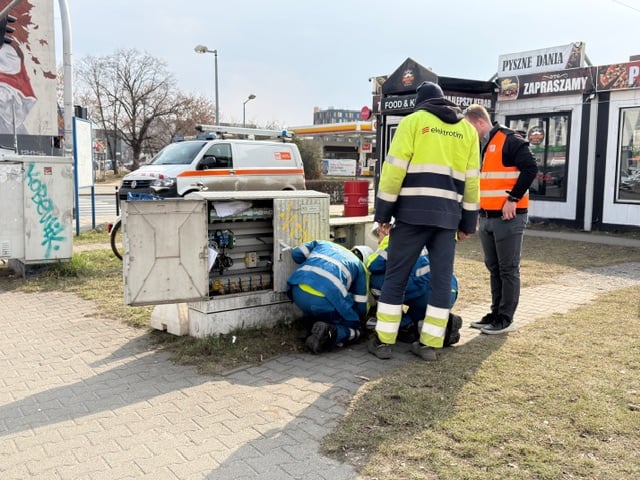 8 / 20 Wróć do artykułu Zerwana sieć energetyczna na Legnickiej. Tramwaje ruszają [AKTUALIZACJA] Zerwana sieć energetyczna na Legnickiej. Tramwaje ruszają [AKTUALIZACJA] Fot. Nadia Szagdaj Przejdź do poprzedniego zdjęcia. Poprzednie Następne Przejdź do kolejnego zdjęcia. Ekipy techniczne przy skrzynce zasilającej.