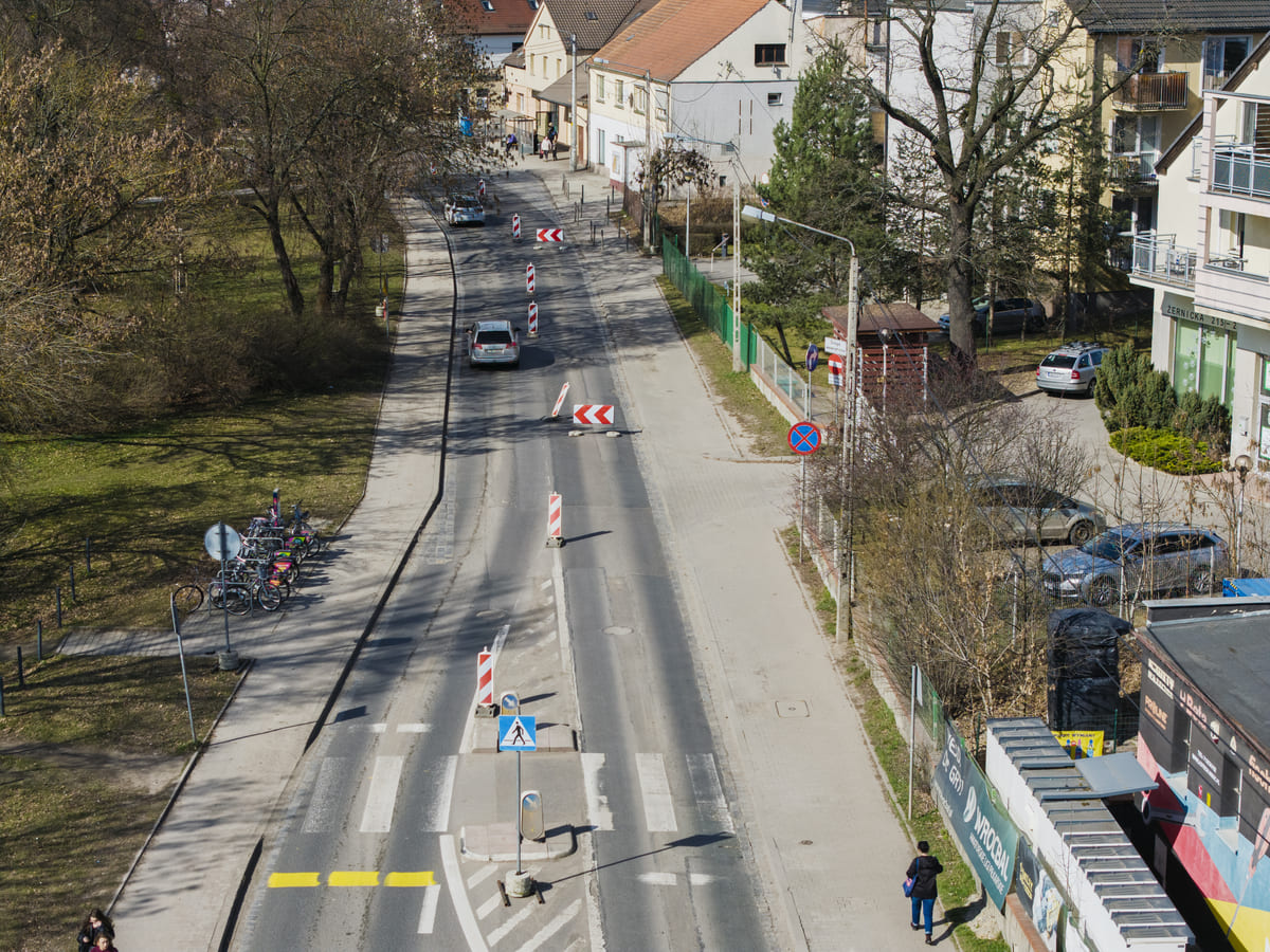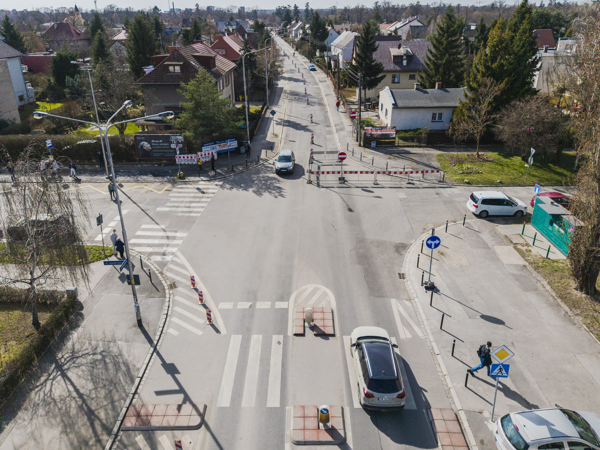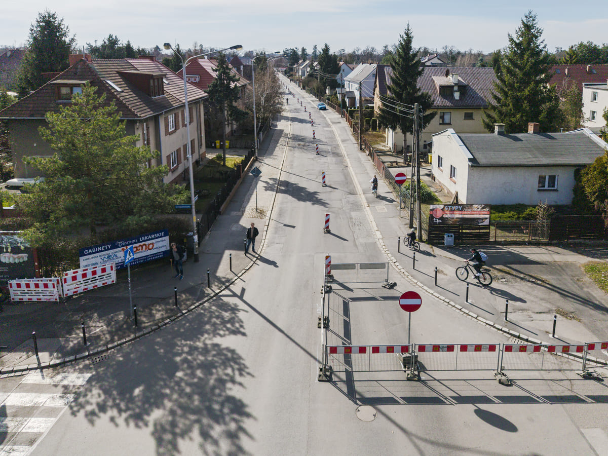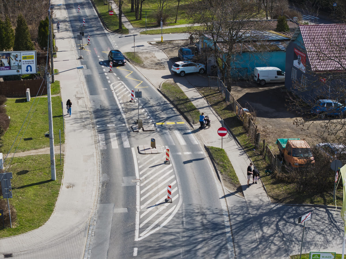 - wdrożone jest połówkowe zajęcie jezdni na całym remontowanym odcinku (od ul. Osobowickiej do ul. Bezpiecznej);
