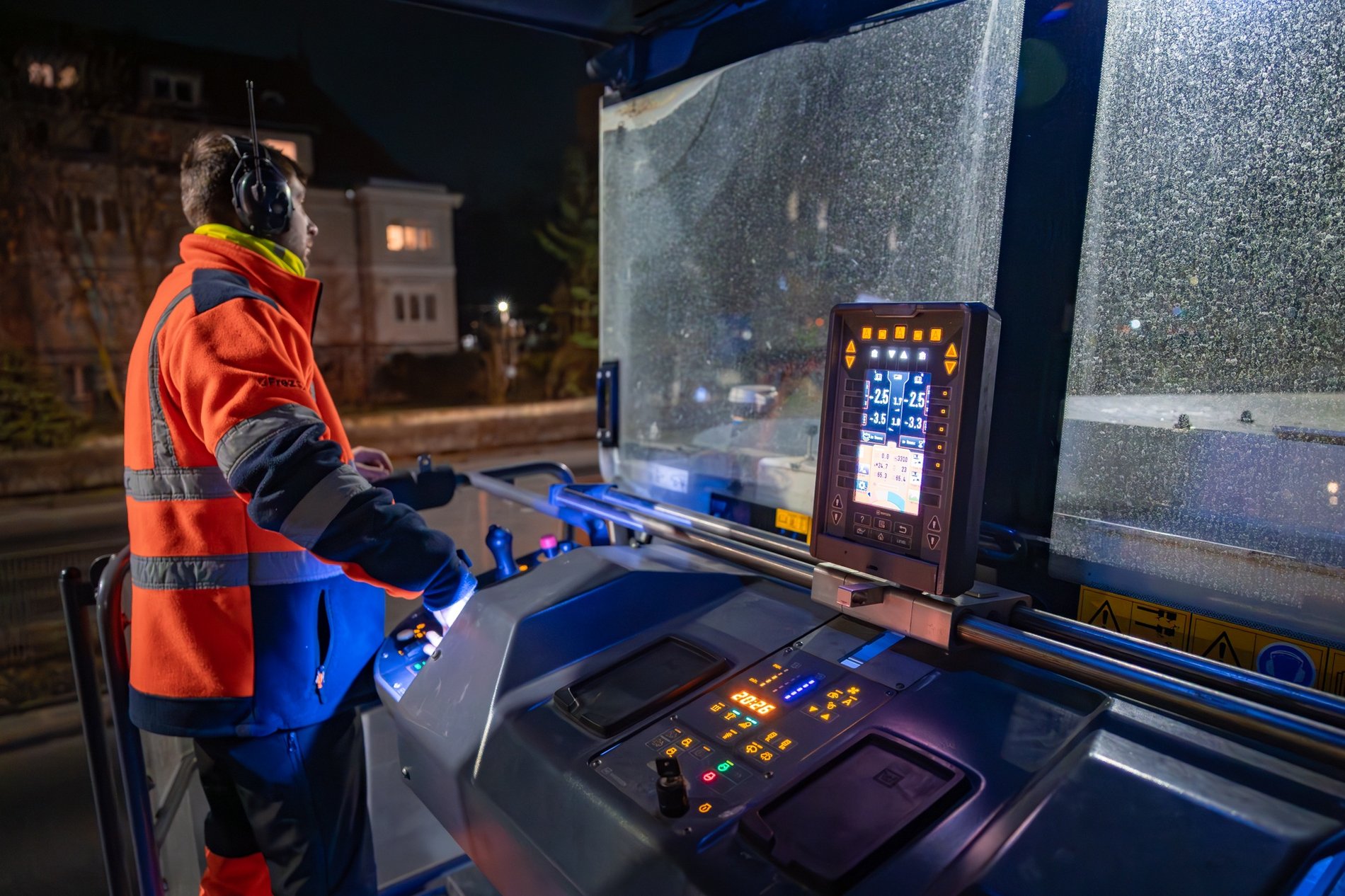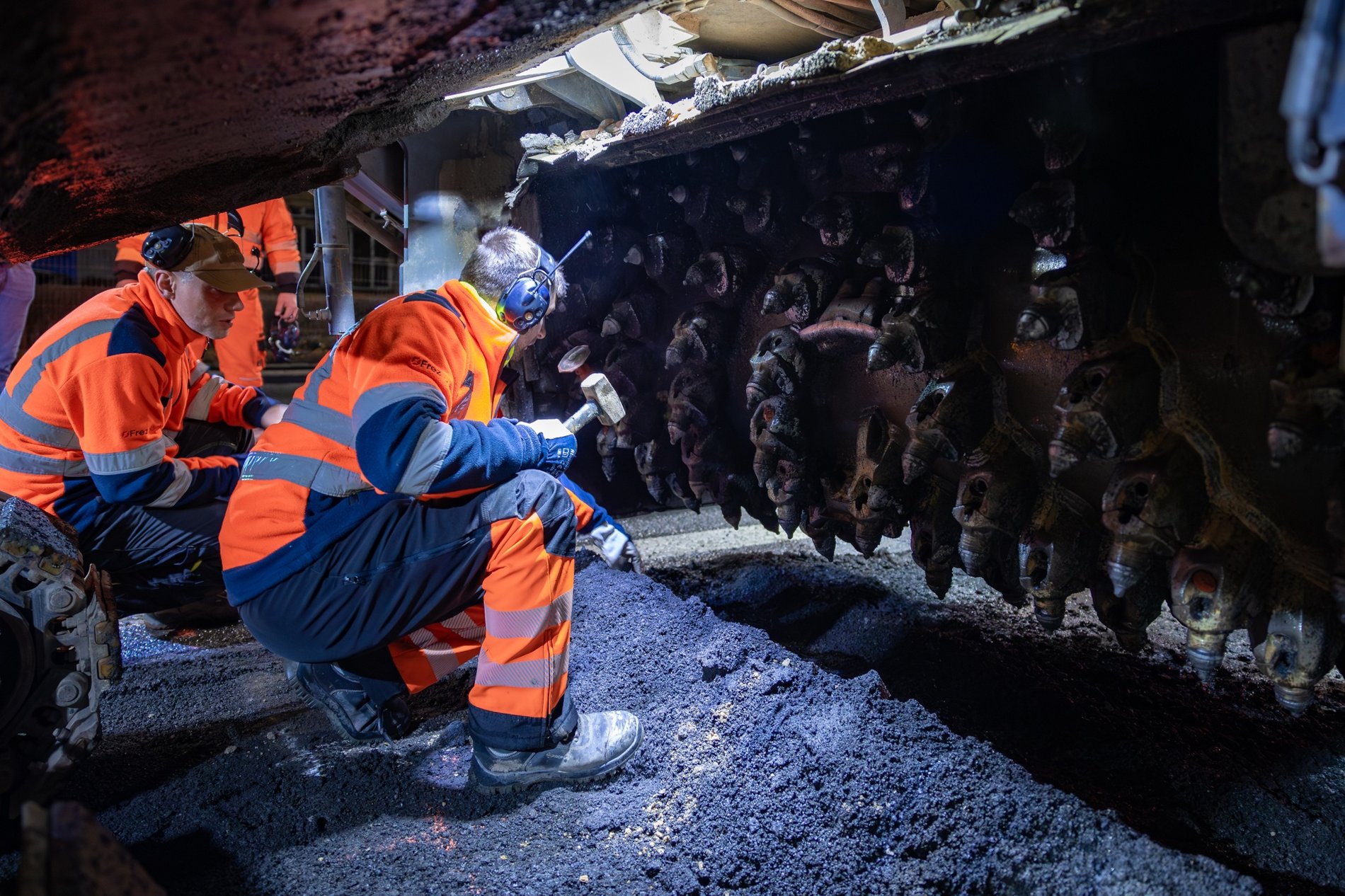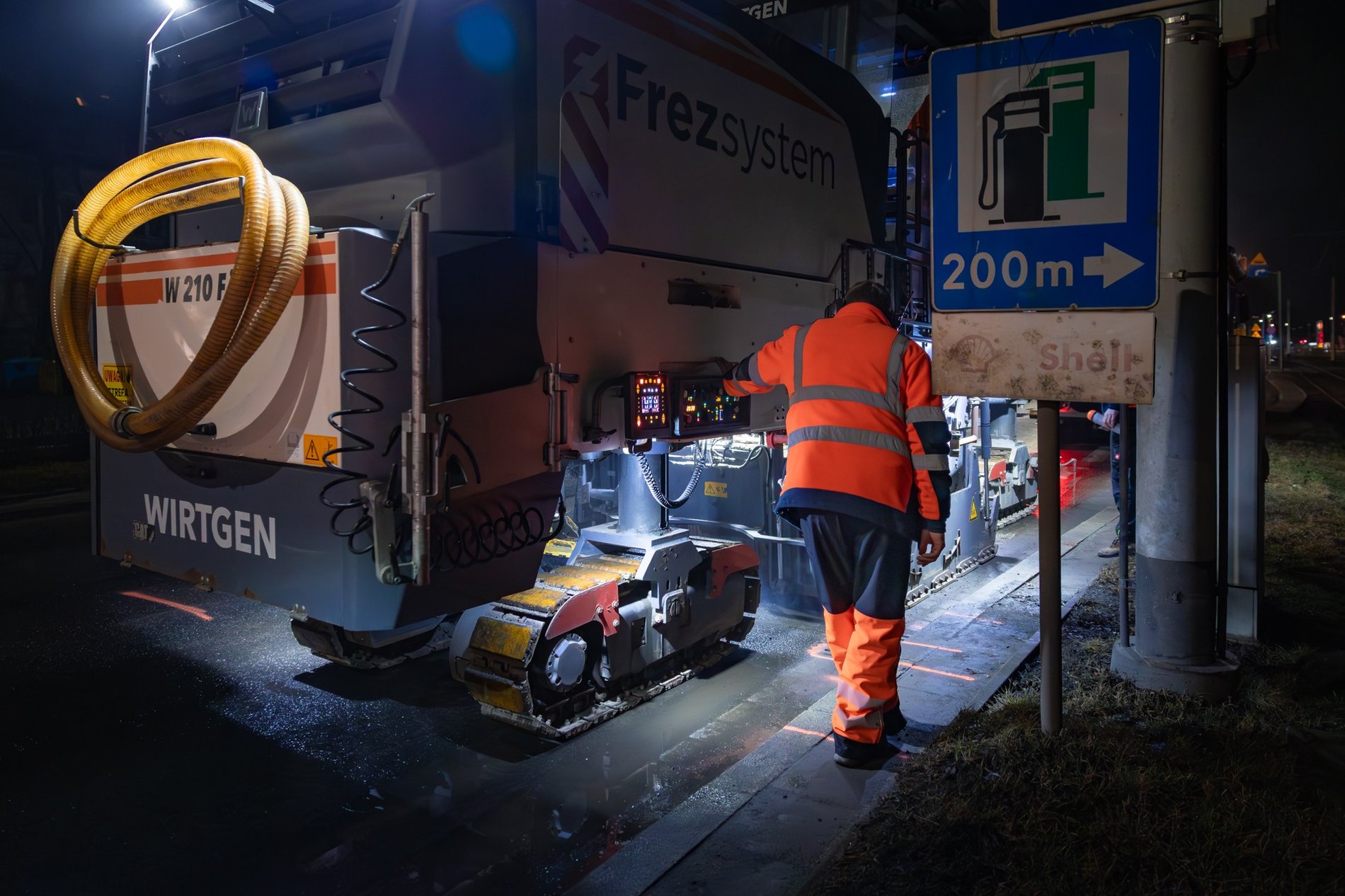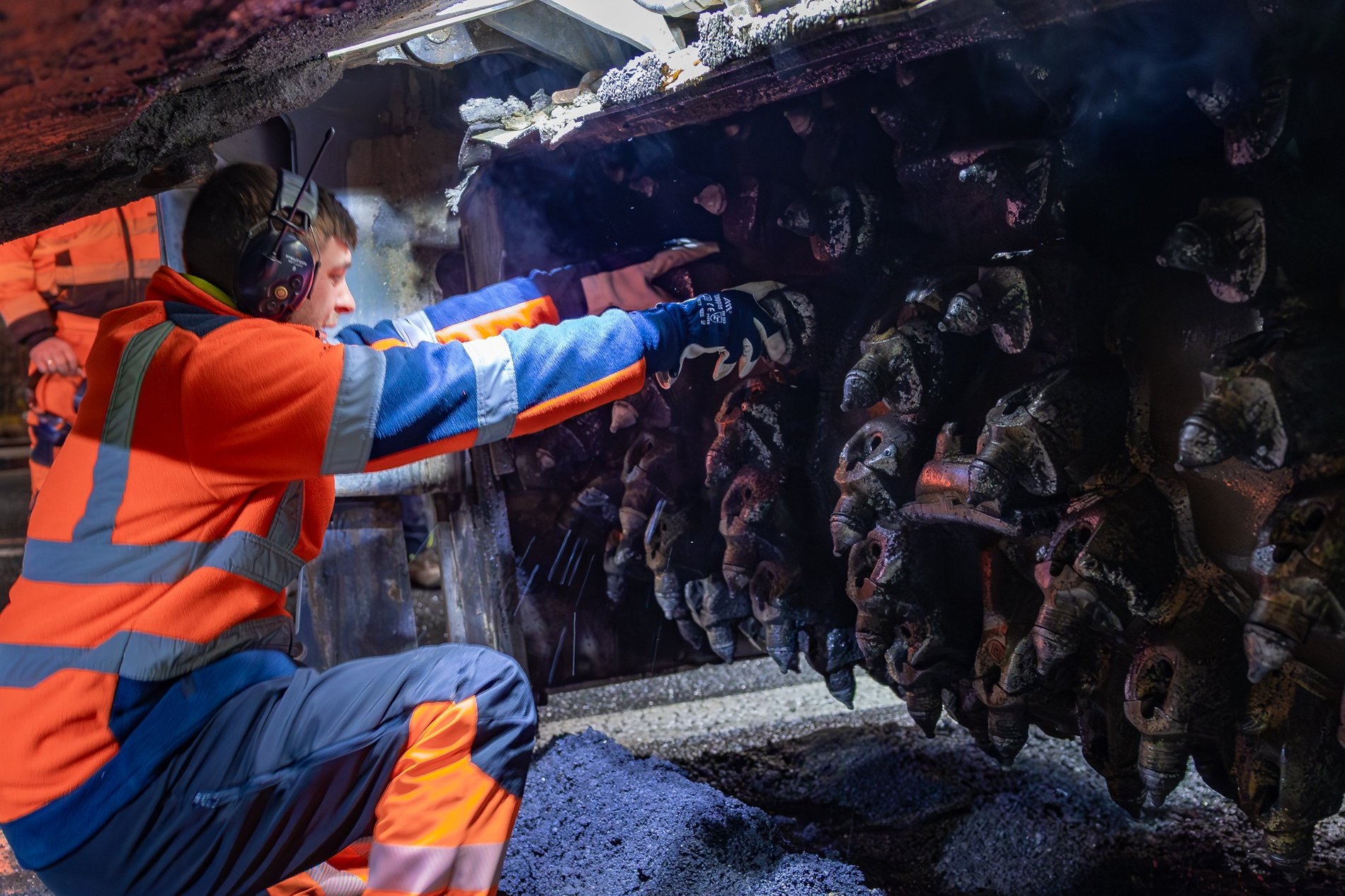 Mężczyzna w pomarańczowym ubraniu roboczym i słuchawkach ochronnych - pracownik przy "pazurach" maszyny frezującej asfalt na ul. Powstańców Śląskich. Fot. Bartosz Mokrzycki