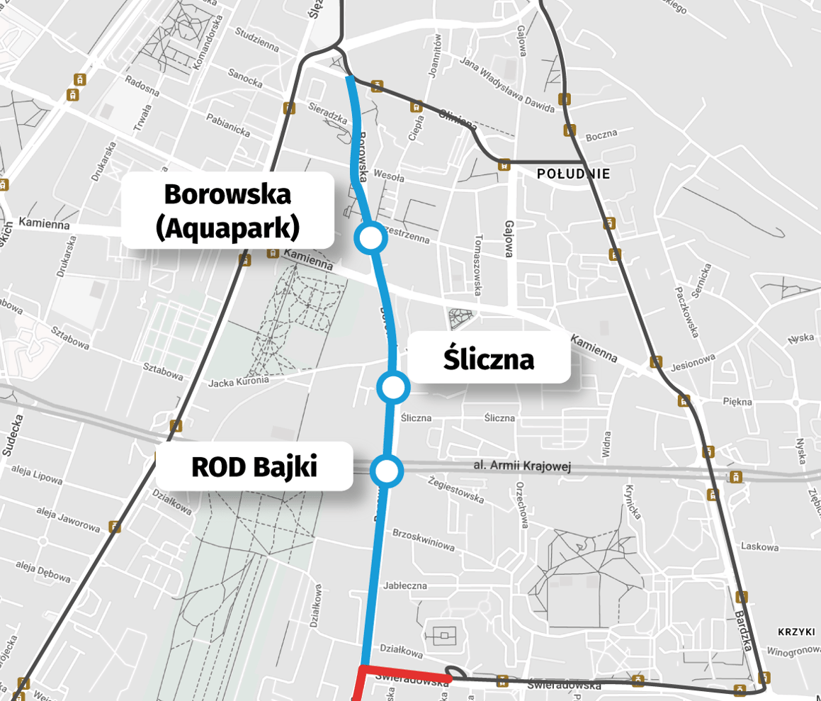Tak też będzie, ale to kolejny etap. Inwestycja została nazwana tramwaj Borowska Centrum. Tory o długości 1,8 km zaczynać się będą od Działkowej i łączyć z tymi przy Glinianej. Zapewni to szybki dojazd do dworca PKP i PKS. Po drodze będą przystanki Borowska (Aquapark), Śliczna oraz ROD Bajki.