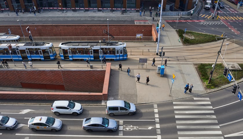 Plac Dominikański we Wrocławiu. Na zdjęciu widać wjazd i wyjazd z tuneli oraz samochody na górze, na drodze, która biegnie nad tunelami