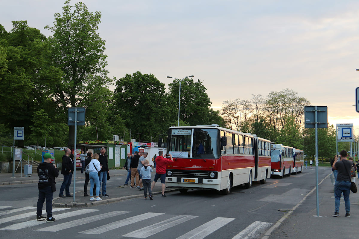 Na wycieczkę zabierze nas przegubowy Ikarus 280.26 z manualną skrzynią biegów i harmonijkowymi drzwiami. Autobusy te kursowały na liniach 104 i 111 w zasadzie od początku ich eksploatacji, czyli od wczesnych lat 80. ubiegłego stulecia, a w późniejszych latach kojarzyły się z obsługą linii 604 przez DLA. Ikarusy 280.26 wycofano we Wrocławiu dopiero w 2009 r. O historii tych pojazdów można przeczytać na stronie internetowej KSTM.