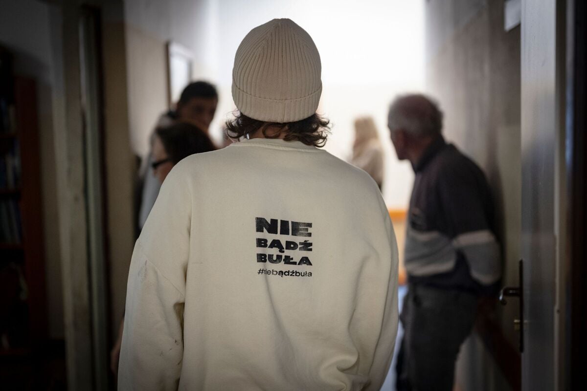 Albert Wrotnowski w bluzie z napisem: nie bądź buła, podziel się