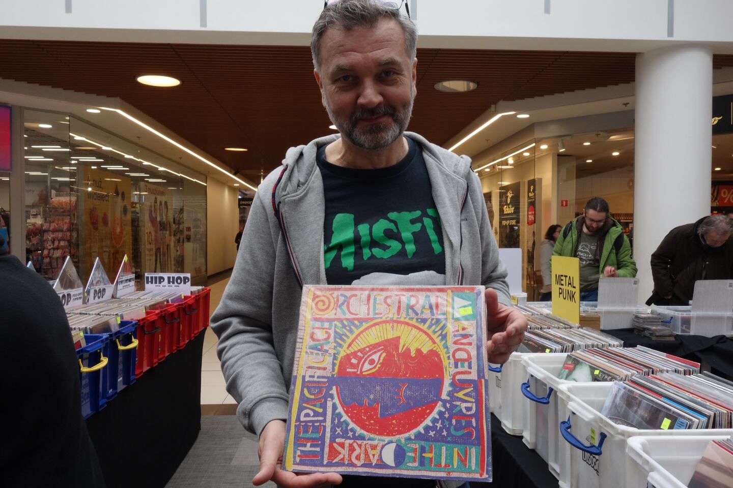 Na zdjęciu winyle na giełdzie w Centrum Handlowym Borek – Pan Sławomir pokazuje wyjątkowo ciekawą okładkę