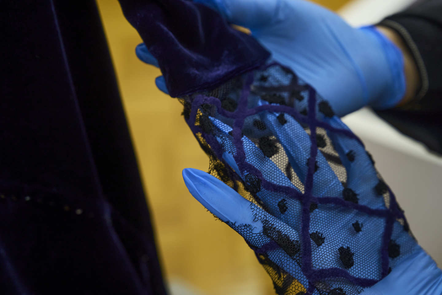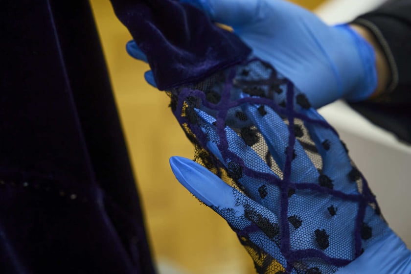 Suknia noblowska Olgi Tokarczuk na wystawie stałej w Pałacu Królewskim – kustosz Magdalena Szmida-Półbratek pokazuje detale